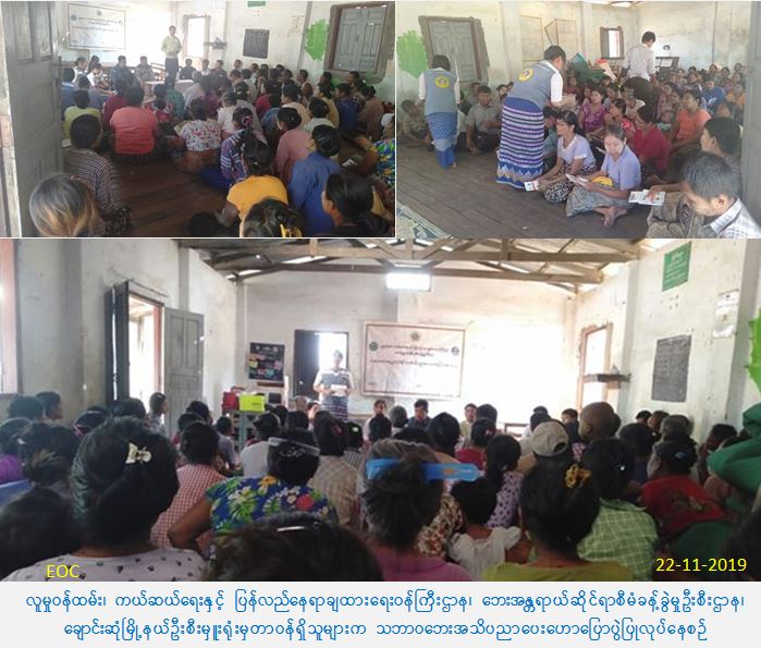 လူမှုဝန်ထမ်း၊ ကယ်ဆယ်ရေးနှင့် ပြန်လည်နေရာချထားရေးဝန်ကြီးဌာန၊ ဘေးအန္တရာယ်ဆိုင်ရာစီမံခန့်ခွဲမှုဦးစီးဌာန၊ ချောင်းဆုံမြို့နယ်ဦးစီးမှူးရုံးမှတာဝန်ရှိသူများသည် မြို့နယ်သဘာဝဘေး စီမံခန့်ခွဲမှု ကော်မတီနှင့် ပူးပေါင်း၍ (၂၂-၁၁-၂၀၁၈) ရက်နေ့၊ (၁၀:၀၀) နာရီမှ (၁၂:၀၀) နာရီအထိ ချောင်းဆုံမြို့နယ်၊ ဇီးကုန်းကျေးရွာ၊ (အ.မ.က) မူလွန် စာသင်ကျောင်း၌ ကျေးရွာပြည်သူ (၉၀) ဦးခန့်အား သဘာဝဘေးအသိပညာပေးဟောပြောဆွေးနွေးခဲ့ပြီး သဘာဝဘေးအသိပညာပေး လက်ကမ်းစာစောင်များ ဝေငှပေးခဲ့ပါကြောင်းသတင်းရရှိပါသည်။