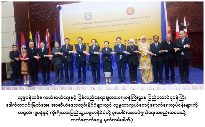 အာဆီယံ+၃ နိုင်ငံများဖြစ်သည့် တရုတ်၊ ဂျပန် ၊ကိုရီးယားပြည်သူ့သမ္မတနိုင်ငံများမှ ဆွေးနွေးရာတွင် ဂျပန်နိုင်ငံအနေဖြင့် အာဆီယံဒေသတွင်းနိုင်ငံများနှင့် ပူးပေါင်း၍ လူမှုဝန်ထမ်း လုပ်ငန်းရပ်များ၊ သက်ကြီးရွယ်အိုစောင့်ရှောက်ရေးလုပ်ငန်းများ၊လူတိုင်းအကျုံးဝင် မသန်စွမ်းသူများ ဖွံ့ဖြိုးရေးဆိုင်ရာ ရပ်ရွာအခြေပြုလုပ်ငန်းများ၊ မသန်စွမ်းများအတွက် အလုပ်အကိုင်အခွင့်အလမ်း များ ဖော်ဆောင်ရန်သင်တန်းများ ရရှိရေး၊ အာဆီယံဒေသတွင်းနိုင်ငံများရှိ လူမှုဝန်ထမ်းလုပ်ငန်း ရပ်များအား လေ့လာ၍ ပိုမိုဖွံ့ဖြိုးတိုးတက်အောင် ပူးပေါင်းဆောင်ရွက်သွားမည်ဖြစ်ကြောင်း၊