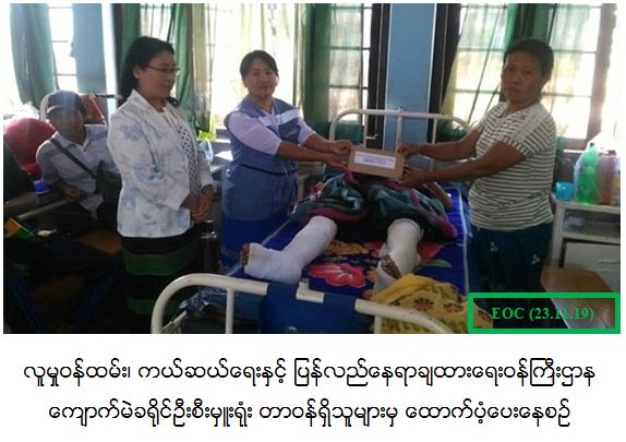 လူမှုဝန်ထမ်း၊ ကယ်ဆယ်ရေးနှင့်ပြန်လည်နေရာချထားရေးဝန်ကြီးဌာန၊ ဘေးအန္တရာယ်ဆိုင်ရာစီမံခန့်ခွဲမှုဦးစီးဌာန၊ ကျောက်မဲခရိုင်ဦးစီးမှူးရုံးမှ တာဝန်ရှိသူများသည် (၂၀-၁၁-၂၀၁၉) ရက်နေ့၌ ကျောက်မဲမြို့နယ်၊ မန်ခေါက်ကျေးရွာအုပ်စု၊ မန်ကန်ကျေးရွာတွင် မိုင်းနင်းမိ၍ ဒါဏ်ရာရရှိသူ (၁) ဦးအတွက် ထောက်ပံ့ငွေ (၅၀,၀၀ဝိ/-)ကျပ်အား (၂၁-၁၁-၂၀၁၉)ရက်နေ့၌ ကျောက်မဲမြို့ပြည်သူ့ဆေးရုံကြီးတွင် ပြည်သူများလက်ဝယ်အရောက်ထောက်ပံ့ပေးခဲ့ကြောင်း သတင်းရရှိပါသည်။