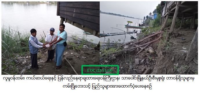 လူမှုဝန်ထမ်းကယ်ဆယ်ရေးနှင့်ပြန်လည်နေရာချထားရေးဝန်ကြီးဌာန၊ ဘေးအန္တရာယ်ဆိုင်ရာစီမံခန့်ခွဲမှုဦးစီးဌာန၊ သာပေါင်းမြို့နယ်ဦးစီးမှူးရုံးမှတာဝန်ရှိသူများသည် သာပေါင်းမြို့နယ်၊ ဆောင်ဘုံကျေးရွာအုပ်စု၊ သုံးအိမ်စုကျေးရွာ ၌ (၂၁-၁၁-၂၀၁၉) ရက်နေ့တွင် ဖြစ်ပွားခဲ့သော ကမ်းပြိုဘေးကြောင့် တစ်စိတ်တစ်ပိုင်းပျက်စီးနေအိမ် (၁) လုံးအတွက် အိမ်ဆောက်ပစ္စည်းဖိုး (၅၀၀၀၀/-)၊ လူဦးရေ (၃) ဦးအတွက် ဆန်ရိက္ခာ (၇) ရက်စာရန်ပုံငွေ (၆၃၀၀/-) စုစုပေါင်းရန်ပုံငွေ(၅၆၃၀၀/- ) အား (၂၂-၁၁-၂၀၁၉) ရက်နေ့ (၁ရး၃၀)နာရီအချိန်တွင် ကျေးရွာအုပ်ချုပ်ရေးမှူးနှင့်တကွ တာဝန်ရှိသူများ၏ ရှေ့မှောက်၌ ဘေးသင့်ပြည်သူများ၏ လက်ဝယ်သို့ ကွင်းဆင်းထောက်ပံ့ပေးအပ်ပြီးဖြစ်ပါကြောင်း သတင်းရရှိပါသည်။