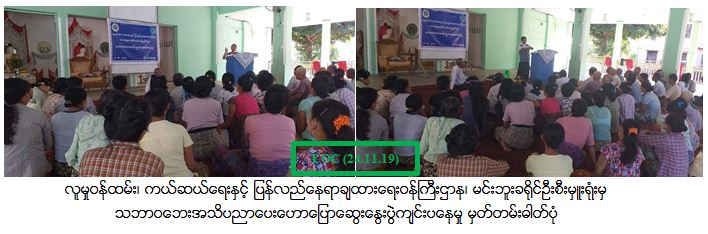 လူမှုဝန်ထမ်း၊ ကယ်ဆယ်ရေးနှင့်ပြန်လည်နေရာချထားရေးဝန်ကြီးဌာန၊ ဘေးအန္တရာယ်ဆိုင်ရာစီမံခန့်ခွဲမှုဦးစီးဌာန၊ မင်းဘူးခရိုင်ဦးစီးမှူးရုံးမှ တာဝန်ရှိသူများသည် (၂၁-၁၁-၂၀၁၉) ရက်နေ့၊ မွန်းလွဲ (၂:၀၀) နာရီမှ (၃:၀၀) နာရီအထိ မင်းဘူး(စကု)မြို့နယ်၊ ကြီးပင်ကန်ကျေးရွာတွင် ပြည်သူလူထု လူဦးရေ (၁၄၀) ဦးအား သဘာဝဘေးအသိပညာပေး ဟောပြောပွဲပြုလုပ်ခဲ့ပြီး အဆိုပါ ဟောပြောပွဲတွင် ဦးစီးဌာန၏ လုပ်ငန်းတာဝန်များ၊ ရည်ရွယ်ချက်များ၊ သဘာဝဘေးနှင့်ဆိုင်သော အသိပညာများ ဟောပြောဆွေးနွေးခဲ့ကြောင်း သတင်းရရှိပါသည်။