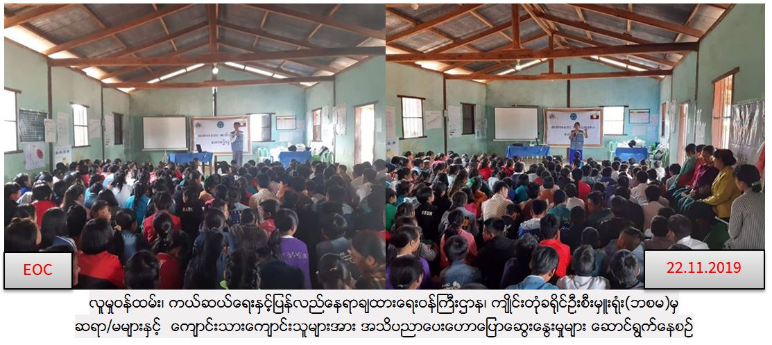 လူမှုဝန်ထမ်း၊ ကယ်ဆယ်ရေးနှင့်ပြန်လည်နေရာချထားရေးဝန်ကြီးဌာန၊ ဘေးအန္တရာယ်ဆိုင်ရာစီမံခန့်ခွဲမှုဦးစီးဌာန၊ ကျိုင်းတုံခရိုင်ဦးစီးမှူးရုံးမှ တာဝန်ရှိသူများသည် (၂၂.၁၁.၂၀၁၉)ရက်နေ့ ကျိုင်းတုံမြို့၊ မိုင်းခွန်ကျေးရွာအုပ်စု၊ အခြေခံပညာအထက်တန်းကျောင်း(ခွဲ)ပန်လီအောက်တွင် ကောျင်းသား/သူများ နှင့် ဆရာ/မ(၄၅၀)ဦးတို့အား သဘာဝဘေးအန္တရာယ်များနှင့်ပတ်သတ်သော ဆောင်ရန်ရှောင်ရန်များအား သိရှိလိုက်နာဆောင်ရွက်နိုင်ရေးအတွက် အသိပညာပေးဟောပြောပွဲကျင်းပကာ တက်ရောက်လာသူများအား အသိပညာပေးလက်ကမ်းစာစောင်များဖြန့်ဝေခဲ့ကြောင်း သတင်းရရှိပါသည်။