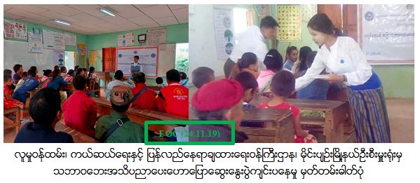 လူမှုဝန်ထမ်း၊ ကယ်ဆယ်ရေးနှင့်ပြန်လည်နေရာချထားရေးဝန်ကြီးဌာန၊ ဘေးအန္တာရာယ်ဆိုင်ရာစီမံခန့် ခွဲမှုဦးစီးဌာန၊ မိုင်းပျဉ်းမြို့နယ်ဦးစီးမှူးရုံးမှ တာဝန်ရှိသူများသည် (၂၃-၁၁-၂၀၁၉) ရက်နေ့၊ (၁၃:၀၀) မှ (၁၄:၃၀) နာရီအထိ မိုင်းပျဉ်းမြို့နယ်၊ ယမ်းမိုင်ကျေးရွာအုပ်စု၊ ဝမ်ကောင်းရွာတွင် လူဦးရေ (၇၅) ဦးခန့်အား သဘာဝဘေးအသိပညာပေး ဟောပြောဆွေးနွေးခဲ့ပြီး အဆိုပါ ဟောပြောပွဲတွင် ဦးစီးဌာန၏ လုပ်ငန်းတာဝန်များ၊ ရည်ရွယ်ချက်များ၊ ထောက်ပံ့မှုနှုန်းထားများ၊ ဘေး (၈) မျိုး ဆောင်ရန်/ရှောင်ရန်များ၊ ငလျင်လှုပ်ခတ်စဉ်အတွင်း နေထိုင်ရမည့်အနေအထားများအား လက်တွေ့သရုပ်ပြခြင်း၊ လက်ကမ်းစာစောင်များ ဖြန့်ဝေပေးခြင်းများ ဆောင်ရွက်ခဲ့ကြောင်း သတင်းရရှိပါသည်။
