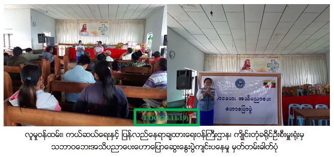 လူမှုဝန်ထမ်း၊ ကယ်ဆယ်ရေးနှင့်ပြန်လည်နေရာချထားရေးဝန်ကြီးဌာန၊ ဘေးအန္တရာယ်ဆိုင်ရာစီမံခန့်ခွဲမှုဦးစီးဌာန၊ ကျိုင်းတုံခရိုင်ဦးစီးမှူးရုံးမှ တာဝန်ရှိသူများသည် (၂၄.၁၁..၂၀၁၉) ရက်နေ့၊ နံနက် (၉:၀၀) နာရီ မှ (၁၂:၀၀) နာရီ ထိ ကျိုင်းတုံမြို့၊ မိုင်းခွန်ကျေးရွာအုပ်စု၊ ပန်လီအောက်ကျေးရွာတွင် ရွာသူ/ရွာသား (၇၀) တို့ဦး အား သဘာဝဘေးအန္တရာယ်များနှင့်ပတ်သက်သော ဆောင်ရန်/ ရှောင်ရန်အချက်များအား သိရှိလိုက်နာဆောင်ရွက်နိုင်ရေးအတွက် သဘာဝဘေးလျော့ပါးရေးအသိပညာပေး ဟောပြောပွဲကို ကျင်းပပြုလုပ်ခဲ့ပြီး အဆိုပါ ဟောပြောပွဲ သို့ တက်ရောက်လာသူများအား သဘာဝဘေးအသိပညာပေးလက်ကမ်းစာစောင်များ၊ ဖြန့်ဝေပေးခဲ့ကြောင်း သတင်းရရှိပါသည်။