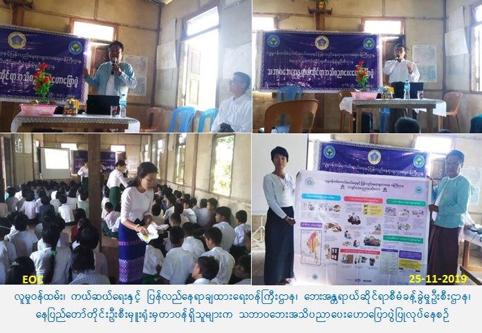 လူမှုဝန်ထမ်း၊ ကယ်ဆယ်ရေးနှင့် ပြန်လည်နေရာချထားရေးဝန်ကြီးဌာန၊ ဘေးအန္တရာယ်ဆိုင်ရာ စီမံခန့်ခွဲမှုဦးစီးဌာန၊ နေပြည်တော်တိုင်းဦးစီးမှူးရုံးမှ တာဝန်ရှိသူများသည် (၂၅-၁၁-၂၀၁၉) ရက်နေ့၊ (၀၉:၃၀) ချိန်မှ (၁၁:၃၀) ချိန်အထိ ဒက္ခိဏသိရီမြို့နယ်၊ ရွာသစ်ကျေးရွာ၊ အ.လ.က (ရွာသစ်) တွင်် ကျောင်းသား/ သူများအား သဘာဝဘေးအန္တရာယ်များနှင့် ပတ်သက်သော ဆောင်ရန်/ ရှောင်ရန် အချက်များကို သိရှိလိုက်နာဆောင်ရွက်နိုင်ရေးအတွက် သဘာဝဘေးအသိပညာပေးဟောပြောပွဲ ကို ကျင်းပပြုလုပ်ခဲ့ရာ ကျောင်းသား/ သူ (၂၁၆) ဦး တက်ရောက်ခဲ့ပြီး တက်ရောက်လာသူများအား သဘာဝဘေးအသိပညာပေးလက်ကမ်းစာစောင်များ၊ ဗီနိုင်းပိုစတာများနှင့် နံရံကပ်ပိုစတာများ ဖြန့်ဝေပေးခဲ့ပါကြောင်း သတင်းရရှိပါသည်။