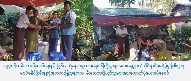 လူမှုဝန်ထမ်း၊ ကယ်ဆယ်ရေးနှင့် ပြန်လည်နေရာချထားရေးဝန်ကြီးဌာန၊ ဘေးအန္တရာယ်ဆိုင်ရာ စီမံခန့်ခွဲမှုဦးစီးဌာန၊ ဖျာပုံခရိုင်ဦးစီးမှူးရုံးမှ တာဝန်ရှိသူများသည် နိုဝင်ဘာလ (၂၄) ရက်နေ့ (၂၃:၄၅) အချိန်တွင် ဖျာပုံမြို့အမှတ် (၁၅) ရပ်ကွက်၊ အောင်ရတနာ (၄) လမ်းတွင် မီးဘေးဖြစ်ပွားခဲ့ရာ နေအိမ်တစ်စိတ်တစ်ပိုင်းမီးဘေးသင့်ခဲ့ခြင်းအတွက် အိမ်ဆောက်ပစ္စည်းဖိုးထောက်ပံ့ငွေ (၃၀၀၀၀/-) ကျပ်နှင့် ဆန်ရိက္ခာဖိုးထောက်ပံ့ငွေ (၆၃၀၀/-) ကျပ်တို့ကို နိုဝင်ဘာလ (၂၅) ရက်နေ့တွင် မီးဘေးသင့်ပြည်သူများလက်ဝယ်သို့ သွားရောက်ထောက်ပံ့ခဲ့ပါကြောင်း သတင်းရရှိပါသည်။