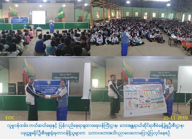 လူမှုဝန်ထမ်း၊ ကယ်ဆယ်ရေးနှင့် ပြန်လည်နေရာချထားရေးဝန်ကြီးဌာန၊ ဘေးအန္တရာယ်ဆိုင်ရာစီမံခန့်ခွဲမှုဦးစီးဌာန၊ ပခုက္ကူခရိုင်ဦးစီးမှူးရုံးမှတာဝန်ရှိသူများသည် (၂၅-၁၁-၂၀၁၉) ရက်နေ့ နံနက် (၉:၀၀) မှ (၁၂:၀၀) အထိ အ.ထ.က (၁) ကျောင်း ပခုက္ကူမြို့တွင် ကျောင်းသား/ သူ စုစုပေါင်း (၅၅၀) ဦးတို့အား ဦးစီးဌာန၏လုပ်ငန်းတာဝန်များ၊ သဘာဝဘေးအန္တရာယ်များနှင့် ပတ်သက်၍ ကြိုတင် ပြင်ဆင်နိုင်ရန်အတွက် ဆောင်ရန်/ ရှောင်ရန်များကို အသိပညာပေးဟောပြောခဲ့ပြီး ဘေး (၈) မျိုးလက်ကမ်းစာစောင်များနှင့် ငလျင်ဘေးဗီနှိုင်းတို့ကို ဖြန့်ဝေပေးအပ်ခဲ့ပါကြောင်း သတင်းရရှိ ပါသည်။
