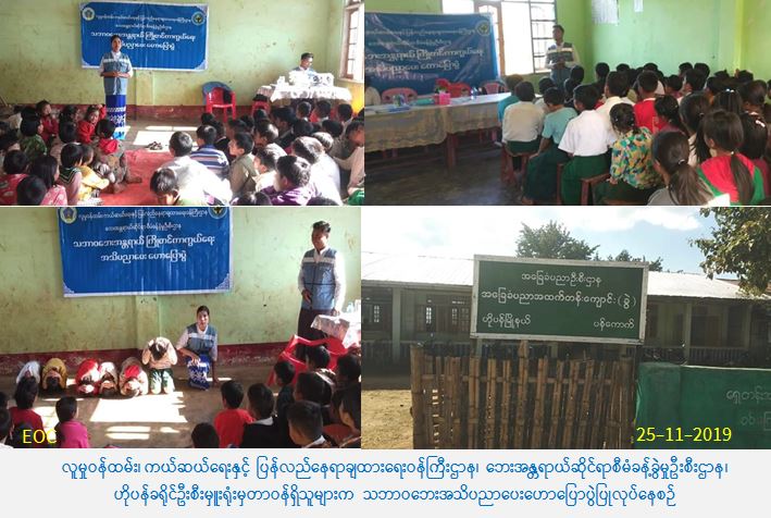 လူမှုဝန်ထမ်း၊ ကယ်ဆယ်ရေးနှင့် ပြန်လည်နေရာချထားရေးဝန်ကြီးဌာန၊ ဘေးအန္တရာယ်ဆိုင်ရာစီမံခန့်ခွဲမှုဦးစီးဌာန၊ ဟိုပန်ခရိုင်ဦးစီးမှူးရုံးမှတာဝန်ရှိသူများသည် (၂၅-၁၁-၂၀၁၉) ရက်နေ နံနက်ပိုင်း (၀၉:၀၀) နာရီမှ (၁၀:၃၀) နာရီအချိန် ထိဟိုပန်မြို့နယ်၊ ကောင်းကော်ကျေးရွာ အခြေခံပညာမူလတန်းလွန်ကျောင်း၌ သဘာဝဘေးအသိပညာပေးဟောပြောပွဲ ကျင်းပပြုလုပ်ခဲ့ရာ ဆရာ၊ ဆရာမများ နှင့် ကျောင်းသား/ သူ (၁၂၀) ဦးခန့်တက်ရောက်ခဲ့ပါသည်။ ဆက်လက်၍ တာဝန်ရှိသူများသည် (၁၃:၃၀) နာရီမှ (၁၅:၀၀) နာရီအချိန်ထိ ဟိုပန်မြို့နယ်၊ ပန်ကောက်ကျေးရွာ၊ အခြေခံပညာ အထက်တန်းကျောင်း (ခွဲ) တွင် သဘာဝဘေးအန္တရာယ်နှင့် စပ်လျဉ်းသည့် ဆောင်ရန်/ ရှောင်ရန်တို့ကိုဟောပြောပြီး လက်ကမ်းစာဆောင်များဖြန့်ဝေခဲ့ရာ ဆရာ/ ဆရာမများနှင့် ကျောင်းသား/ သူ (၂၅၀) ဦးခန့်တက်ရောက်ခဲ့ပါကြောင်း သတင်းရရှိပါသည်။