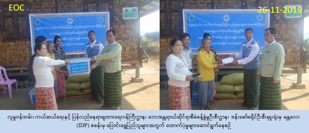 လူမှုဝန်ထမ်း၊ ကယ်ဆယ်ရေးနှင့် ပြန်လည်နေရာချထားရေးဝန်ကြီးဌာန၊ ဘေးအန္တရာယ်ဆိုင်ရာစီမံခန့်ခွဲမှုဦးစီးဌာန၊ ဗန်းမော်ခရိုင်ဦးစီးမှူးရုံးမှ တာဝန်ရှိသူများသည် (၂၆-၁၁-၂၀၁၉) ရက်နေ့၊ ( ၁၀ : ၀၀ ) နာရီအချိန်တွင် ဗန်းမော်ခရိုင်၊ မိုးမောက်မြို့နယ်၊ မန္တလေး (IDP) စခန်းမှ နနင့်လှိုင်ကွက်သစ်နှင့် နောင်ပေါင်းကျေးရွာသို့ ပြောင်းရွှေ့အိမ်ထောင်စု (၄) စု၊ လူဦးရေ (၁၆) ဦးတို့အတွက် ပလပ်စတစ်ပုံးအပါအဝင် ကယ်ဆယ်ရေးပစ္စည်း (၁၈)မျိုး၊ ပုံး (၄) ပုံး၊ လူဦးရေ (၁၆) ဦးအတွက် တစ်လစာဆန်အိတ်(၅)အိတ် ၊ တန်ဖိုးငွေ(၁၅၀,၀၀၀)နှင့် ပြောင်းရွှေ့စရိတ် (၁)အိမ်လျှင် (၁၀၀,၀၀၀) ကျပ်နှုန်းဖြင့် (၄၀၀,၀၀၀) ကျပ်၊ စုစုပေါင်းထောက်ပံ့ငွေ (၅၅၀,၀၀၀) ကို သွားရောက်ထောက်ပံ့ခဲ့ကြောင်းသတင်းရရှိပါသည်။