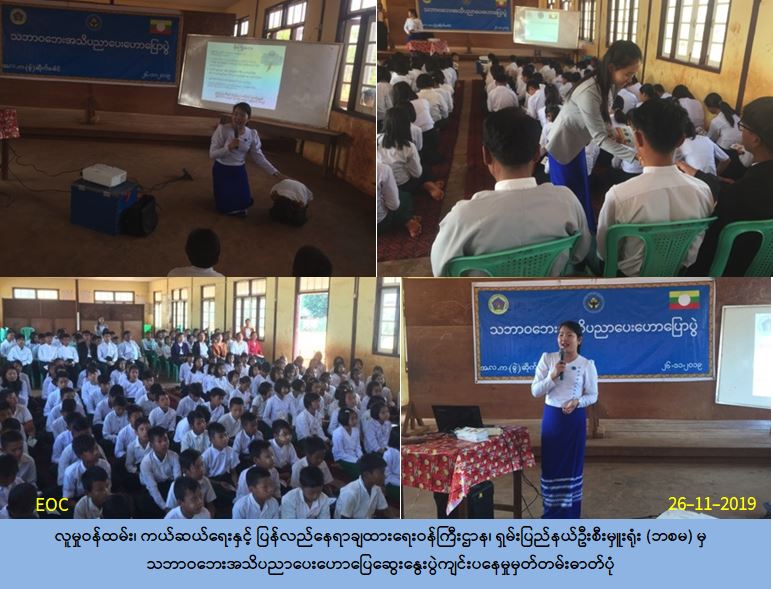လူမှုဝန်ထမ်း၊ ကယ်ဆယ်ရေးနှင့် ပြန်လည်နေရာချထားရေးဝန်ကြီးဌာန၊ ဘေးအန္တရာယ်ဆိုင်ရာ စီမံခန့်ခွဲမှုဦးစီးဌာန၊ ရှမ်းပြည်နယ်ဦးစီးမှူးရုံးမှ တာဝန်ရှိသူများသည် (၂၆-၁၁-၂၀၁၉) ရက် နေ့လည် (၁၃:၀၀) အချိန်မှ (၁၄:၁၅) အချိန်ထိ ဆီဆိုင်မြို့နယ် အ.လ.က (ခွဲ) ဇေယျသုခ ဆိုက်ခေါင်၌ ကျောင်းသား/ သူ (၂၅၀) ဦးအား သဘာဝဘေးအသိပညာပေးဟောပြောပွဲ ပြုလုပ်ခဲ့ပြီးလက်ကမ်းစာစောင်များ ဖြန့်ဝေခြင်း၊ ပညာပေးဗွီဒီယိုပြသခြင်းသရုပ်ပြသခြင်းများ အား ပြုလုပ်ခဲ့ပါကြောင်းသတင်းရရှိပါသည်။