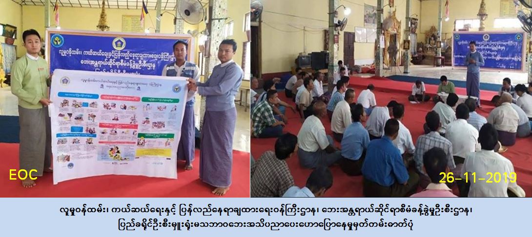 လူမှုဝန်ထမ်း ၊ ကယ်ဆယ်ရေးနှင့် ပြန်လည်နေရာချထားရေးဝန်ကြီးဌာန၊ ဘေးအန္တရာယ်ဆိုင်ရာစီမံခန့်ခွဲမှု ဦးစီးဌာန ၊ ပြည်ခရိုင်ဦးစီးမှူးရုံးမှ တာဝန်ရှိသူများသည် ( ၂၆ – ၁၁ – ၂၀၁၉ ) ရက်နေ့တွင် ပြည်ခရိုင်၊ ပုတီးကုန်းမြို့၊ အန္တရာယ်ကင်းဓမ္မာရုံ၌ ( ၁၃ : ၀၀ ) နာရီမှ ( ၁၅ : ၀၀ ) နာရီအချိန်ထိ ပြည်သူလူထုဦးရေ (၁၀၀) အား သဘာဝဘေးအန္တရာယ်ဆိုင်ရာ အသိပညာပေးဟောပြောပွဲ ကျင်းပပြုလုပ်ခဲ့ပြီး ခေါက်ဆွဲခြောက်ထုပ်၊ အသိ ပညာပေးလက်ကမ်းစာစောင်များနှင့် ဗီနိုင်းပိုစတာများ ပေးအပ်ဝေငှခဲ့ကြောင်း သတင်းရရှိပါသည်။
