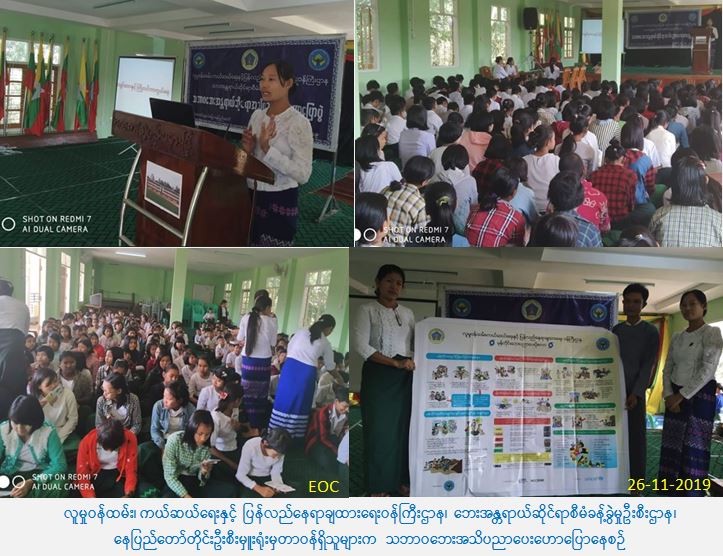 လူမှုဝန်ထမ်း၊ ကယ်ဆယ်ရေးနှင့် ပြန်လည်နေရာချထားရေးဝန်ကြီးဌာန၊ ဘေးအန္တရာယ်ဆိုင်ရာစီမံခန့်ခွဲမှုဦးစီးဌာန၊ နေပြည်တော်တိုင်းဦးစီးမှူးရုံးမှ တာဝန်ရှိသူများသည် (၂၆-၁၁-၂၀၁၉) ရက်နေ့၊ (၁၃:၃၀) နာရီ မှ (၁၅:၃၀) အချိန်အထိ ပျဉ်းမနားမြို့၊ အ.ထ.က (၃) စာသင်ကျောင်းတွင်် ကျောင်းသား/ သူများအား သဘာဝဘေးအန္တရာယ်များနှင့် ပတ်သက်သော ဆောင်ရန်/ ရှောင်ရန် အချက်များကို သိရှိလိုက်နာဆောင်ရွက်နိုင်ရေးအတွက် သဘာဝဘေးအသိပညာပေးဟောပြောပွဲ ကို ကျင်းပပြုလုပ်ခဲ့ရာ ကျောင်းသား/ သူ (၂၈၀) ဦး တက်ရောက်ခဲ့ပြီး တက်ရောက်လာသူများအား သဘာဝဘေးအသိပညာပေးလက်ကမ်းစာစောင်များ၊ ဗီနိုင်းပိုစတာများနှင့် နံရံကပ်ပိုစတာများ ဖြန့်ဝေပေးခဲ့ပါကြောင်း သတင်းရရှိပါသည်။