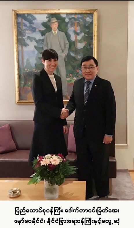 နော်ဝေနိုင်ငံ၊ အော်စလိုမြို့သို့ရောက်ရှိနေသော ပြည်ထောင်စုဝန်ကြီးဒေါက်တာဝင်းမြတ်အေးသည် ယမန်နေ့ နိုဝင်ဘာလ (၂၅)ရက်နေ့ မွန်းလွဲပိုင်းတွင် နော်ဝေနိုင်ငံ၊ နိုင်ငံခြားရေးဝန်ကြီး Ms. Ine Eriksen Soreide နှင့် တွေ့ဆုံခဲ့ပါသည်။