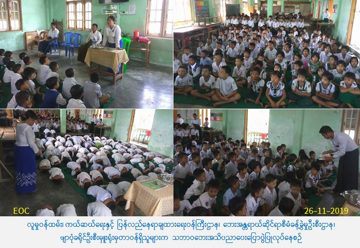 လူမှုဝန်ထမ်း၊ ကယ်ဆယ်ရေးနှင့် ပြန်လည်နေရာချထားရေးဝန်ကြီးဌာန၊ ဘေးအန္တရာယ်ဆိုင်ရာ စီမံခန့်ခွဲမှုဦးစီးဌာန၊ ဖျာပုံခရိုင်ဦးစီးမှူးရုံးမှ တာဝန်ရှိသူများသည် နိုဝင်ဘာလ (၂၆) ရက်နေ့တွင် နောက်ပြန်တိုးကျေးရွာအုပ်စု၊ ကျုံဓမင်းကျေးရွာ၊ အလယ်တန်းကျောင်းတွင် သဘာဝဘေးအသိ ပညာပေးဟောပြောပွဲကျင်းပပြုလုပ်ခဲ့ရာ ကျောင်းသား၊ ကျောင်းသူများနှင့် ကျေးရွာပြည်သူများ (၂၃၀) ဦးတို့တက်ရောက်ခဲ့ပြီး လက်ကမ်းစာစောင်များကိုလည်း ဖြန့်ဝေပေးခဲ့ပါကြောင်းသတင်း ရရှိပါသည်။
