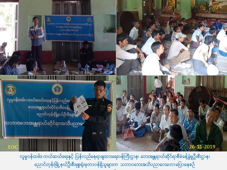 လူမှုဝန်ထမ်း၊ ကယ်ဆယ်ရေးနှင့် ပြန်လည်နေရာချထားရေးဝန်ကြီးဌာန၊ ဘေးအန္တရာယ်ဆိုင်ရာ စီမံခန့်ခွဲမှုဦးစီးဌာန၊ ညောင်တုန်းမြို့နယ်ဦးစီးမှူးရုံးမှ တာဝန်ရှိသူများသည် ညောင်တုန်းမြို့နယ် မီးသတ်ဦးစီးဌာန၊ မြို့နယ်အထွေထွေအုပ်ချုပ်ရေးဦးစီးဌာနမှ တာဝန်ရှိသူများနှင့် အတူ ညောင်တုန်းမြို့နယ်၊ ဝဲဒေါင့်အတွင်းကျေးရွာအုပ်စု၊ ကုန်းဝဲဒေါင့်ကျေးရွာ၌ (၂၆-၁၁-၂၀၁၉ ) ရက်နေ့ (၁၃:၀၀) နာရီအချိန်တွင် သဘာဝဘေးအန္တရာယ်ဆိုင်ရာအသိပညာပေးဟောပြောပွဲ ကျင်းပပြုလုပ်ခဲ့ရာ ကျေးရွာပြည်သူလူထု (၈၀) ဦးခန့်တက်ရောက်ခဲ့ပြီး အသိပညာပေး လက်ကမ်းစာစောင်များကိုလည်း ဖြန့်ဝေပေးအပ်ခဲ့ပါကြောင်း သတင်းရရှိပါသည်။