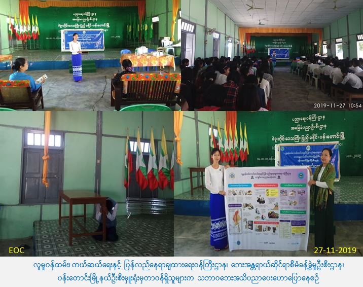 လူမှုဝန်ထမ်း၊ ကယ်ဆယ်ရေးနှင့် ပြန်လည်နေရာချထားရေးဝန်ကြီးဌာန၊ ဘေးအန္တရာယ်ဆိုင်ရာစီမံခန့်ခွဲမှုဦးစီးဌာန၊ ပန်းတောင်းမြို့နယ်ဦးစီးမှူးရုံးမှ တာဝန်ရှိသူများသည် ပန်းတောင်းမြို့၊ (အ.ထ.က) ပန်းတောင်း၌ (၂၇-၁၁-၂၀၁၉) ရက်နေ့ နံနက် (၁၀:၀၀) နာရီအချိန်မှ နံနက် (၁၁:၀၀) နာရီအချိန်အထိ ဆရာ၊ ဆရာမများနှင့် ကျောင်းသား၊ ကျောင်းသူ (၃၀၀) ဦးတို့အား သဘာဝဘေး အသိပညာပေးဟောပြောပွဲပြုလုပ်ခဲ့ပြီး တက်ရောက်လာသူမျာအား လက်ကမ်းစာစောင်များ၊ ဗလာ စာအုပ်များဝေငှခဲ့ပြီး ကျောင်းအုပ်ဆရာမကြီးထံသို့ ငလျင်ဘေးဗီနိုင်းပိုစတာ ပေးအပ်ခဲ့ပါကြောင်း သတင်းရရှိပါသည်။
