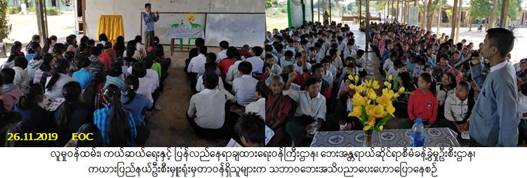 လူမှုဝန်ထမ်း၊ ကယ်ဆယ်ရေးနှင့် ပြန်လည်နေရာချထားရေးဝန်ကြီးဌာန၊ ဘေးအန္တရာယ်ဆိုင်ရာစီမံခန့်ခွဲမှုဦးစီး ဌာန၊ ကယားပြည်နယ်ဦးစီးမှူးရုံးမှတာဝန်ရှိသူများသည် (၂၆-၁၁-၂၀၁၉) ရက်နေ့၊ (၁၄:၀၀)နာရီအချိန်မှ (၁၅:၃၀)နာရီအချိန်အထိ လွိုင်ကော်မြို့နယ်၊ အ.ထ.က(နွားလဝိုး)ကျောင်း၌ ကျောင်းသား/ကျောင်းသူ(၃၀၀)ဦးကို သဘာဝဘေးအန္တရာယ်နှင့်စပ်လျဉ်း၍ အသိပညာပေးဟောပြောခဲ့ပြီး တက်ရောက်လာသူများအား လက်ကမ်း စာစောင်များဖြန့်ဝေခဲ့ပါကြောင်း သတင်းရရှိပါသည်။