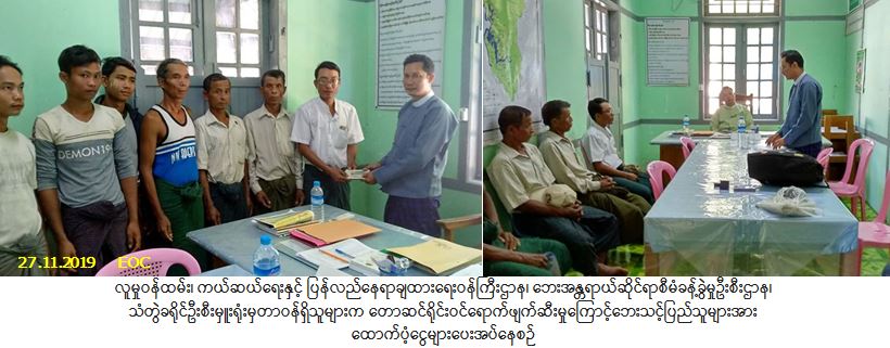 လူမှုဝန်ထမ်း၊ ကယ်ဆယ်ရေးနှင့် ပြန်လည်နေရာချထားရေးဝန်ကြီးဌာန၊ ဘေးအန္တရာယ်ဆိုင်ရာစီမံခန့်ခွဲမှုဦးစီး ဌာန၊ သံတွဲခရိုင်ဦးစီးမှူးရုံးမှတာဝန်ရှိသူများသည် ရခိုင်ပြည်နယ်၊ သံတွဲခရိုင်၊ ဂွမြို့နယ်၊ ရွှေတွင်းတူး ကျေးရွာအုပ်စု၌ (၂၃-၁၁-၂၀၁၉) ရက်နေ့တွင်ဖြစ်ပွားခဲ့သော တောဆင်ရိုင်းဝင်ရောက်ဖျက်ဆီးမှုကြောင့် လုံးဝပျက်စီးအိမ်ခြေ (၁) လုံးအတွက် အိမ်ဆောက်ပစ္စည်ဖိုးထောက်ပံ့ငွေ (၅၀,၀၀ဝ/-) ကျပ်၊ ဘေးသင့်အိမ်ထောင်စု(၇)စုမှ လူဦးရေ (၂၇) ဦးတို့အတွက် ဆန်ရိက္ခာ (၇) ရက်စာဖိုးထောက်ပံ့ငွေ (၅၆,၇၀ဝ/-) ကျပ်တို့ကို (၂၇-၁၁-၂၀၁၉) ရက်နေ့တွင် သွားရောက်ထောက်ပံ့ပေးအပ်ခဲ့ပါကြောင်း သတင်းရရှိပါသည်။