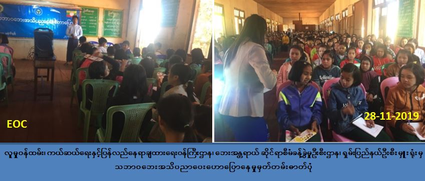 လူမှုဝန်ထမ်း၊ ကယ်ဆယ်ရေးနှင့်ပြန်လည်နေရာချထားရေးဝန်ကြီးဌာန၊ ဘေးအန္တရာယ် ဆိုင်ရာစီမံခန့်ခွဲမှုဦးစီးဌာန၊ ရှမ်းပြည်နယ်ဦးစီးမှူးရုံးမှ တာဝန်ရှိသူများသည် (၂၇-၁၁-၂၀၁၉) ရက်နေ့တွင် အ.ထ.က(နောင်မွန်)၌ ကျောင်းသား/ သူ (၄၀၀) ဦးအား နေ့လည်( ၁၃ : ၀၀ ) နာရီ မှ ( ၁၄ : ၃၀ ) နာရီအချိန်ထိ သဘာဝဘေးအသိပညာပေး ဟောပြောပွဲ ပြုလုပ်ခဲ့ပြီး လက်ကမ်းစာစောင်များဖြန့်ဝေခြင်း၊ ပညာပေးဗွီဒီယိုပြသခြင်း၊ သရုပ်ပြသခြင်း များအား ပြုလုပ်ခဲ့ကြောင်းသတင်းရရှိပါသည်။