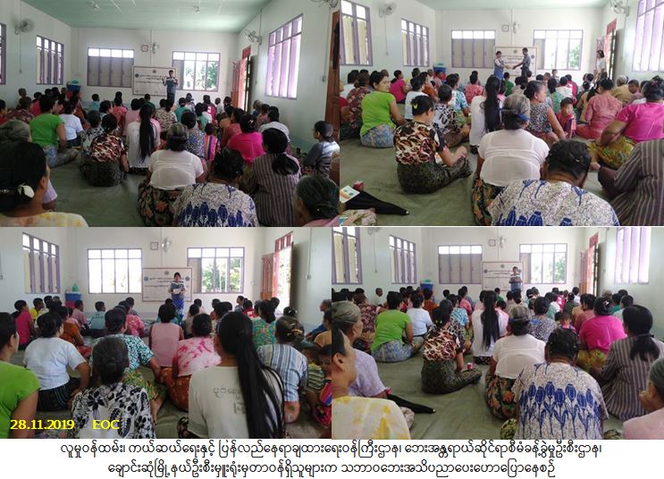 လူမှုဝန်ထမ်း၊ ကယ်ဆယ်ရေးနှင့် ပြန်လည်နေရာချထားရေးဝန်ကြီးဌာန၊ ဘေးအန္တရာယ်ဆိုင်ရာစီမံခန့်ခွဲမှုဦးစီး ဌာန၊ ချောင်းဆုံမြို့နယ်ဦးစီးမှူးရုံးမှတာဝန်ရှိသူများသည် မွန်ပြည်နယ်၊ ချောင်းဆုံမြို့နယ်၊ မုရစ်ကြီး ကျေးရွာခန်းမ၌ (၂၈-၁၁-၂၀၁၉) ရက်နေ့၊ နံနက် (၁၀:၀၀) နာရီမှ (၁၁:၃၀)နာရီအချိန်အထိ ကျေးရွာသူ/သား (၁၁၀) ဦးခန့်ကို သဘာဝဘေးလျော့ပါးရေး အသိပညာပေးဟောပြောခဲ့ရာ ဟောပြောပွဲ၌ သဘာဝဘေး အန္တရာယ်များနှင့်စပ်လျဉ်း၍ ဆောင်ရန်/ရှောင်ရန်အချက်များဟောပြောခြင်း၊ သဘာဝဘေးအသိပညာပေး လက်ကမ်းစာစောင်များဖြန့်ဝေခြင်းတို့ ဆောင်ရွက်ခဲ့ပါကြောင်း သတင်းရရှိပါသည်။