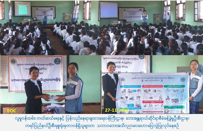 လူမှုဝန်ထမ်း၊ ကယ်ဆယ်ရေးနှင့် ပြန်လည်နေရာချထားရေးဝန်ကြီးဌာန၊ ဘေးအန္တရာယ်ဆိုင်ရာ စီမံခန့်ခွဲမှုဦးစီးဌာန၊ ကရင်ပြည်နယ်ဦးစီးမှူးရုံးမှ တာဝန်ရှိသူများသည် (၂၇-၁၁-၂၀၁၉) ရက်နေ့တွင် ဘားအံမြို့နယ်၊ အ.ထ.က (မြိုင်ကလေး) စက်ရုံကျောင်း၌ ကျောင်းသား/ သူ (၃၀၀) တို့အား ငလျင်ဘေး၊ မိုးကြိုးဘေး၊ မုန်တိုင်းဘေး၊ ရေဘေးနှင့်ပတ်သက်၍ ဆောင်ရန်/ ရှောင်ရန် အချက်များအား အသိပညာပေးဆွေးနွေးဟောပြောခဲ့ပြီး လက်ကမ်းစာစောင်များ၊ ဗီနိုင်းပိုစတာများ ဖြန့်ဝေပေးခဲ့ပါကြောင်းသတင်းရရှိပါသည်။