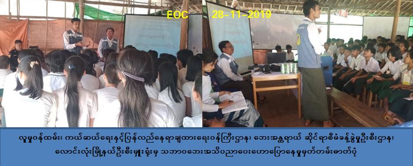 လူမှုဝန်ထမ်း၊ ကယ်ဆယ်ရေးနှင့် ပြန်လည်နေရာချထားရေးဝန်ကြီးဌာန၊ ဘေးအန္တရာယ် ဆိုင်ရာစီမံခန့်ခွဲမှုဦးစီးဌာန၊ လောင်းလုံးမြို့နယ်ဦးစီးမှူးရုံးမှ တာဝန်ရှိသူများသည် လောင်း လုံမြို့နယ် မီးသတ်ဦးစီးဌာနနှင့် ပြန်ကြားရေးနှင့်ပြည်သူ့ဆက်ဆံရေးဦးစီးဌာနမှ တာ၀န်ရှိ သူများနှင့်ပူးပေါင်း၍ ( ၂၈ – ၁၁ – ၂၀၁၉ ) ရက်နေ့၊ နံနက် ( ၁၀ : ၀၀ ) အချိန်မှ ( ၁၂ : ၀၀ ) နာရီအချိန်အထိ လောင်းလုံးမြို့နယ်၊ မကျွန်းမော်ကျေးရွာ၊ မူလတန်းလွန်ကျောင်း၌ ကျောင်းသား / သူ စုစုပေါင်း ( ၁၀၀ )ဦးကို သဘာဝဘေး အန္တရာယ်များနှင့်စပ်လျဉ်း၍ အသိပညာပေးဟောပြောခဲ့ပြီး ဟောပြောပွဲ၌ ဦးစီးဌာန၏လုပ်ငန်းတာဝန်များ၊ သဘာဝ ဘေးအန္တရာယ်နှင့်စပ်လျဉ်း၍ ဆောင်ရန်/ ရှောင်ရန်အချက်များ ဟောပြောခြင်းနှင့် တက်ရောက်လာသူများအား လက်ကမ်းစာစောင်များဖြန့်ဝေပေးခြင်း၊ အသိပညာပေး ဗွီဒီယိုပြသခြင်း၊ သရုပ်ပြခြင်းတို့ ဆောင်ရွက်ခဲ့ကြောင်း သတင်းရရှိပါသည်။