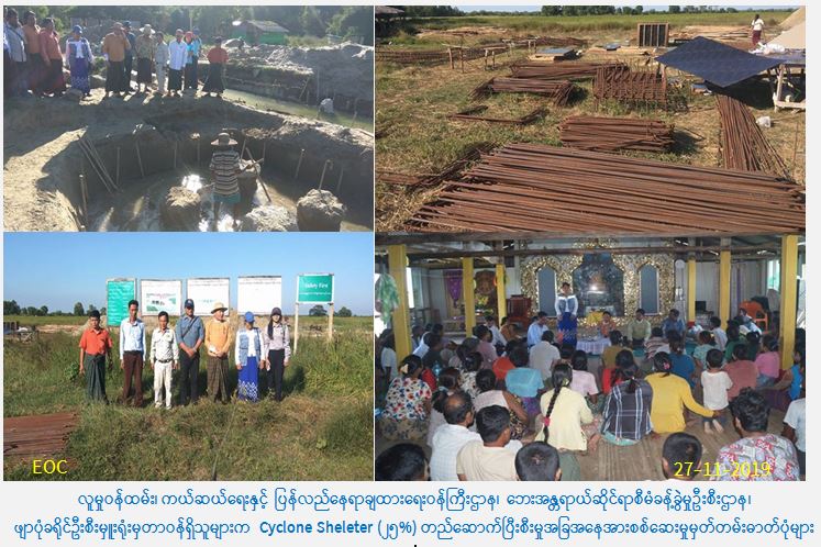 လူမှုဝန်ထမ်း၊ ကယ်ဆယ်ရေးနှင့် ပြန်လည်နေရာချထားရေးဝန်ကြီးဌာန၊ ဘေးအန္တရာယ်ဆိုင်ရာ စီမံခန့်ခွဲမှုဦးစီးဌာန၊ ဖျာပုံခရိုင်ဦးစီးမှူးရုံးမှ တာဝန်ရှိသူများသည် နိုဝင်ဘာလ (၂၇) ရက်နေ့တွင် အမျိုးသားသဘာဝဘေးရန်ပုံငွေဖြင့် KKCG မှ တာဝန်ယူတည်ဆောက်နေသော Cyclone Shelter (၂) လုံးဖြစ်သည့် ဖျာပုံမြို့နယ်၊ အမာမြို့၊ ဘဝသစ်ကျေးရွာအုပ်စု၊ ခေတ္တာကျွန်းတွင် တည်ဆောက် နေသော Cyclone Shelter (၁) လုံးနှင့် ထောင့်ကြီးတန်းကျေးရွာတို့တွင် တည်ဆောက်နေသော Cyclone Shelter (၁) လုံးတို့၏ (၂၅%) ပြီးစီးမှုအခြေအနေအား QC အဖွဲ့၏ (၂၅%) ပြီးစီးကြောင်း အတည်ပြုချက်အရ တိုင်းဒေသကြီးလွှတ်တော်ကိုယ်စားလှယ်၊ မြို့နယ်တည်ဆောက်ရေးကြီး ကြပ်မှုကော်မတီ၊ ကျေးရွာတာဝန်ခံအဖွဲ့ဝင်များမှ ပူးပေါင်းစစ်ဆေးမှုဆောင်ရွက်ခဲ့ကြပါသည်။ ဆက်လက်၍ ခေတ္တာကျွန်း ဘုန်းကြီးကျောင်းတွင် ကျေးရွာပြည်သူများနှင့် လူထုတွေ့ဆုံပွဲကျင်းပ ခဲ့ရာ ပူးပေါင်းပါဝင်ဆောင်ရွက်ခဲ့ပါကြောင်း သတင်းရရှိပါသည်။