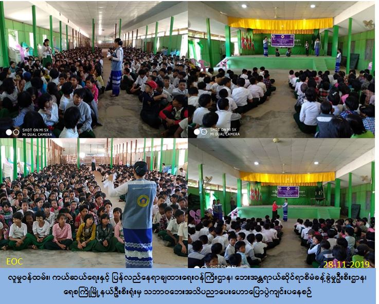 လူမှုဝန်ထမ်း၊ ကယ်ဆယ်ရေးနှင့် ပြန်လည်နေရာချထားရေးဝန်ကြီးဌာန၊ ဘေးအန္တရာယ် ဆိုင်ရာစီမံခန့်ခွဲမှုဦးစီးဌာန၊ ရေစကြိုမြို့နယ်ဦးစီးမှူးရုံးမှ တာဝန်ရှိသူများသည် (၂၈-၁၁-၂၀၁၉) ရက်နေ့၊ (၁၃:၃၀) မှ (၁၄:၃၀) အချိန်အထိရေစကြိုမြို့၊ အ.ထ.က (၁) ကျောင်း၌ ကျောင်းသား/ သူနှင့် ဆရာ/ ဆရာမ (၁၀၀၀) တို့အား ငလျင်ဘေး၊ မိုးကြိုးဘေး၊ မုန်တိုင်းဘေး၊ ရေဘေးနှင့်ပတ်သက်၍ ဆောင်ရန်/ ရှောင်ရန် အချက်များအား အသိပညာ ပေးဆွေးနွေးဟောပြောခြင်းနှင့်ဘောပင်များပေးအပ်ခဲ့ကြောင်းသတင်းရရှိပါသည်။