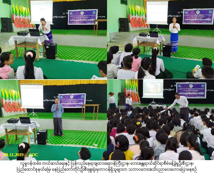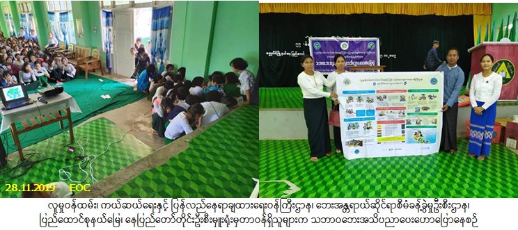 လူမှုဝန်ထမ်း၊ ကယ်ဆယ်ရေးနှင့် ပြန်လည်နေရာချထားရေးဝန်ကြီးဌာန၊ ဘေးအန္တရာယ်ဆိုင်ရာစီမံခန့်ခွဲမှုဦးစီး ဌာန၊ ပြည်ထောင်စုနယ်မြေ၊ နေပြည်တော်တိုင်းဦးစီးမှူးရုံးမှတာဝန်ရှိသူများသည် (၂၈-၁၁-၂၀၁၉)ရက်နေ့၊ (၁၃:၀၀)နာရီအချိန်မှ (၁၅:၀၀)နာရီအချိန်အထိ ဇမ္မူသီရိမြို့နယ်၊ အ.ထ.က(၉)စာသင်ကျောင်း၌ ဆရာ/ဆရာမ၊ ကျောင်းသား/သူ (၆၀၀) ဦးကို သဘာဝဘေးအန္တရာယ်များနှင့်စပ်လျဉ်း၍ ဆောင်ရန်/ရှောင်ရန်အချက်များ၊ သဘာဝဘေးအသိပညာပေးဟောပြောခြင်း၊ ငလျင်ဘေးနှင့်စပ်လျဉ်း၍ အသိပညာပေးဟောပြောခြင်းတို့ ဆောင်ရွက်ခဲ့ပြီး တက်ရောက်လာသူများအား သဘာဝဘေး အသိပညာပေး လက်ကမ်းစာစောင်များ၊ ဗီနိုင်းပိုစတာ၊ နံရံကပ်ပိုစတာနှင့် မုန့်များဖြန့်ဝေပေးခဲ့ပါကြောင်း သတင်းရရှိပါသည်။