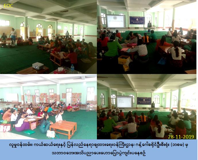 လူမှုဝန်ထမ်း၊ ကယ်ဆယ်ရေးနှင့် ပြန်လည်နေရာချထားရေးဝန်ကြီးဌာန၊ ဘေးအန္တရာယ် ဆိုင်ရာစီမံခန့်ခွဲမှုဦးစီးဌာန၊ ဂန့်ဂေါခရိုင်ဦးစီးမှူးရုံးမှ တာဝန်ရှိသူများ သည် ဂန့်ဂေါခရိုင်၊ ဂန့်ဂေါမြို့ရှိ သာသနာ့ဗိမ္မာန်ခန်းမ၌ လူမှုဝန်ထမ်းဦးစီးဌာနမှဖွင့်လှစ်သည့် ရှေးဦးအရွယ် ကလေးသူငယ်ပြုစုပျိုးထောင်ရေးနှင့် ဖွံ့ဖြိုးရေး ဆိုင်ရာ (အခမဲ့) သင်တန်းတွင် သဘာဝ ဘေးအန္တရာယ်ဆိုင်ရာစီမံခန့်ခွဲမှုဦးစီးဌာန၏ လုပ်ငန်းဆောင်ရွက်မှုအခြေအနေများ၊ သဘာဝဘေးနှင့်ပက်သက်သည့်ဆောင်ရန်၊ ရှောင်ရန် အချက်များ နှင့် DAN Mobile application အား (၂၈-၁၁-၂၀၁၉) ရက်နေ့ (၁၃:ဝဝ) နာရီမှ (၁၅:၀၀) နာရီထိ သင်တန်းသူ၊ သင်တန်းသား (၃၀) ဦးအား ဆွေးနွေးပို့ချခဲ့ပါကြောင်း သတင်းရရှိပါသည်။