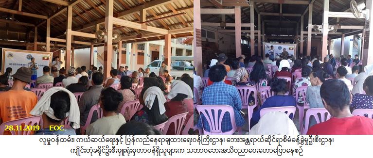 လူမှုဝန်ထမ်း၊ ကယ်ဆယ်ရေးနှင့် ပြန်လည်နေရာချထားရေးဝန်ကြီးဌာန၊ ဘေးအန္တရာယ်ဆိုင်ရာစီမံခန့်ခွဲမှုဦးစီး ဌာန၊ ကျိုင်းတုံခရိုင်ဦးစီးမှူးရုံးမှတာဝန်ရှိသူများသည် (၂၈-၁၁-၂၀၁၉) ရက်နေ့၊ (၀၉:၀၀) နာရီမှ (၁၂:၀၀) နာရီအချိန်အထိ ကျိုင်းတုံမြို့၊ အမှတ်(၄)ရပ်ကွက်၌ ရွာသူ/ရွာသား (၁၀၀) ဉီးခန့်ကို သဘာဝဘေး အန္တရာယ်များနှင့်စပ်လျဉ်း၍ ဆောင်ရန်/ ရှောင်ရန်အချက်များ ဟောပြောခြင်း၊ သဘာဝဘေးလျော့ပါးရေး အသိပညာပေးဟောပြောခြင်းတို့ ဆောင်ရွက်ခဲ့ပြီး တက်ရောက်လာသူများအား လက်ကမ်းစာစောင်များ ဖြန့်ဝေပေးခဲ့ပါကြောင်း သတင်းရရှိပါသည်။