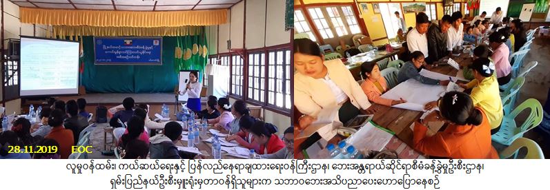 လူမှုဝန်ထမ်း၊ ကယ်ဆယ်ရေးနှင့် ပြန်လည်နေရာချထားရေးဝန်ကြီးဌာန၊ ဘေးအန္တရာယ်ဆိုင်ရာစီမံခန့်ခွဲမှုဦးစီး ဌာန၊ ရှမ်းပြည်နယ်ဦးစီးမှူးရုံးမှတာဝန်ရှိသူများသည် ရှမ်းပြည်နယ်တောင်ပိုင်း၊ တောင်ကြီးခရိုင်၊ ပင်လောင်းမြို့နယ်၊ အ.ထ.က(၂) ကျောင်းခန်းမ၌ (၂၈-၁၁-၂၀၁၉) ရက်နေ့တွင် မြို့နယ်အဆင့် သဘာဝဘေးအန္တရာယ်ဆိုင်ရာစီမံခန့်ခွဲမှုသင်တန်းဖွင့်ပွဲကို ကျင်းပပြုလုပ်ခဲ့ရာ သင်တန်းသား/သူ (၅၀) ဦး တက်ရောက်ခဲ့ပါသည်။ သင်တန်းအတွင်း တက်ရောက်လာသူများက အပြန်အလှန်ဆွေးနွေးမှုများ ဆောင်ရွက်ခဲ့ပြီး (၂၉-၁၁-၂၀၁၉) ရက်နေ့တွင်လည်း အဆိုပါသင်တန်းကို ဆက်လက်ကျင်းပပြုလုပ်သွားမည် ဖြစ်ပါကြောင်း သတင်းရရှိပါသည်။