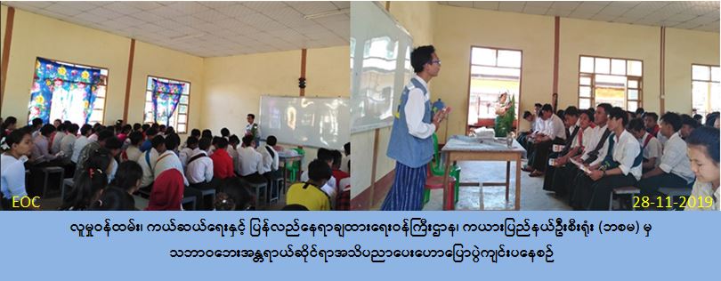 လူမှုဝန်ထမ်း၊ ကယ်ဆယ်ရေးနှင့် ပြန်လည်နေရာချထားရေးဝန်ကြီးဌာန၊ ဘေးအန္တရာယ် ဆိုင်ရာစီမံခန့်ခွဲမှုဦးစီးဌာန၊ ကယားပြည်နယ်ဦးစီးမှူးရုံးမှ (၂၈-၁၁-၂၀၁၉) ရက်နေ့ (၁၃:၀၀) နာရီမှ (၁၄:၃၀) နာရီအထိ လွိုင်ကော်မြို့နယ်၊ အ.ထ.က (ကုန်းသာ) ကျောင်းရှိ ကျောင်းသား/ ကျောင်းသူ (၁၂၅) ဦးအား သဘာဝဘေးအန္တရာယ်ဆိုင်ရာအသိပညာပေး ဟောပြောခဲ့ပြီး တက်ရောက်လာသူများကို လက်ကမ်းစာစောင်များဝေငှခဲ့ပါကြေင်း သတင်းရရှိပါသည်။