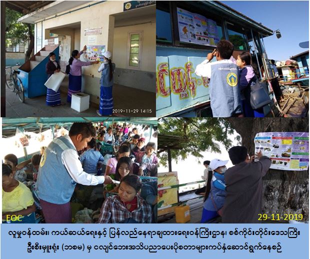 လူမှုဝန်ထမ်း၊ ကယ်ဆယ်ရေးနှင့် ပြန်လည်နေရာချထားရေးဝန်ကြီးဌာန၊ ဘေးအန္တရာယ် ဆိုင်ရာစီမံခန့်ခွဲမှုဦးစီးဌာန၊ စစ်ကိုင်းတိုင်းဒေသကြီးဦးစီးမှူးရုံးမှ တာဝန်ရှိသူများသည် (၂၉-၁၁-၂၀၁၉) ရက်နေ့တွင် အများပြည်သူများ သဘာဝဘေးအန္တရာယ်ဆိုင်ရာ အသိပညာပေးသည့်အနေဖြင့် ချင်းတွင်း မြစ်ကမ်းတစ်လျောက်ရှိ အမြန်ရေယာဉ်ဂိတ်များ/ အမြန်ရေယာဉ်များပေါ်နှင့် အဝေးပြေး ကားဂိတ်များ/ မီးရထားဘူတာများတွင် ငလျင်ဘေးအန္တရာယ်ဆိုင်ရာအသိပညာပေးပိုစတာများ သွားရောက်ကပ်ယူပြီးစီးခဲ့ပါ ကြောင်း သတင်းရရှိပါသည်။