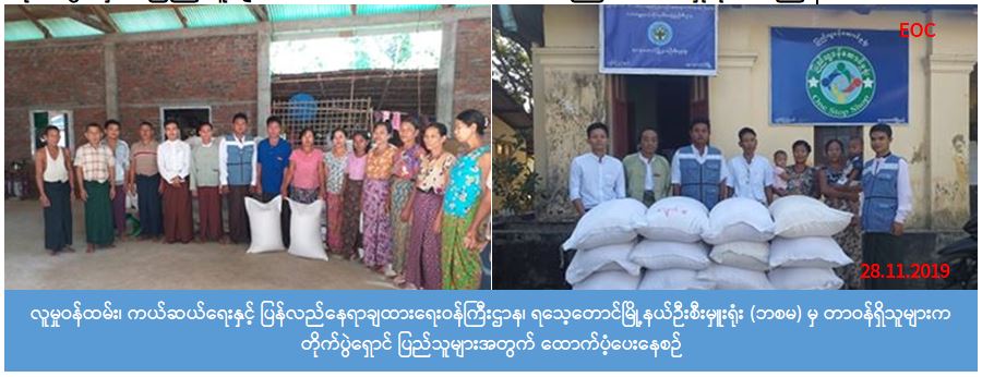 ရခိုင်ပြည်နယ်၊ ရသေ့တောင်မြို့နယ်အတွင်းရှိ တိုက်ပွဲရှောင်ပြည်သူများ နေရပ်စွန့်ခွာပြီး ယာယီခိုလှုံနေထိုင်လျက်ရှိသည့် စုရပ်၁၉ခုရှိ တိုက်ပွဲရှောင် အိမ်ထောင်စု(၈၃၁)စု၊ လူဦးရေ(၃,၆၉၉)ဦးအတွက်ထပ်မံ၍ ဆန်ရိက္ခာ(၁)လစာ ဆန်(၁,၁၅၅)အိတ် (၂၂)ပြည်(၄)ဘူးအား ရသေ့တောင်မြို့နယ်ဦးစီးမှူးရုံးမှ(၂၈.၁၁.၂၀၁၉) ရက်တွင် မြို့နယ်အထွေထွေအုပ်ချုပ်ရေးဦးစီးဌာနမှတာဝန်ရှိသူများနှင့်အတူ ရပ်ကျေးအုပ်ချုပ်ရေးမှူးတို့ဖြင့် တိုက်ပွဲရှောင်ပြည်သူများအား ထောက်ပံ့ပေးအပ်ခဲ့ကြောင်း သိရှိရပါသည်။