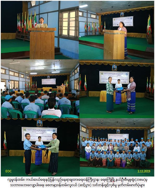 လူမှုဝန်ထမ်း၊ ကယ်ဆယ်ရေးနှင့် ပြန်လည်နေရာချထားရေးဝန်ကြီးဌာန၊ ဘေးအန္တရာယ်ဆိုင်ရာစီမံခန့်ခွဲမှုဦးစီးဌာန၊ ရေစကြိုမြို့နယ်ဦးစီးမှူးရုံးမှ တာဝန်ရှိသူများသည် (၂-၁၂-၂၀၁၉) ရက်နေ့ (၉:၀၀) နာရီအချိန်တွင် ရေစကြိုမြို့နယ်၊ အထွေထွေအုပ်ချုပ်ရေးမှူးအစည်းအဝေးခန်းမ၌ သဘာဝဘေးလျော့ပါးရေး စေတနာ့ဝန်ထမ်း လူငယ်(ဆင့်ပွား) သင်တန်းအမှတ်စဉ် (၁/၂၀၁၉) ဖွင့်ပွဲအခမ်းအနားကျင်းပခဲ့ရာ မြို့နယ်အုပ်ချုပ်ရေးမှူး၊ပခုက္ကူခရိုင်ဦးစီးမှူး၊ ဌာနဆိုင်ရာများ၊ သင်တန်းသား/ သူ စုစုပေါင်းအင်အား (၇၅) ဦးတက်ရောက်ခဲ့ပါသည်။ အဆိုပါသင်တန်းကို (၂-၁၂-၂၀၁၉) ရက်နေ့မှ (၄-၁၂-၂၀၁၉) ရက်နေ့အထိ သင်တန်းသား (၃၀) ဦး ဖြင့်ဖွင့်လှစ်ပြုလုပ်သွားမည်ဖြစ်ကြောင်း သတင်းရရှိပါသည်။