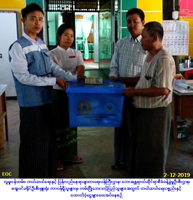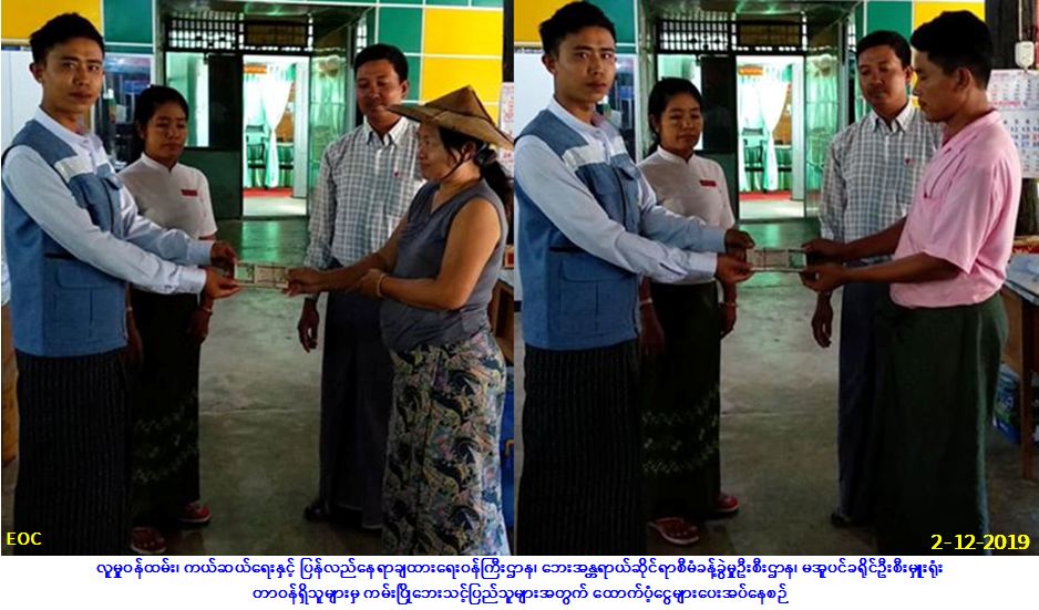 လူမှုဝန်ထမ်း၊ ကယ်ဆယ်ရေးနှင့် ပြန်လည်နေရာချထားရေးဝန်ကြီးဌာန၊ ဘေးအန္တရာယ်ဆိုင်ရာစီမံခန့်ခွဲမှု ဦးစီးဌာန၊ မအူပင်ခရိုင်ဦးစီးမှူးရုံးမှ တာဝန်ရှိသူများသည် မအူပင်ခရိုင်၊ ဓနုဖြူမြို့နယ်၊ စံကင်းကျေးရွာ အုပ်စု၊ စံကင်းကျေးရွာ၌ (၁-၁၂-၂၀၁၉) ရက်နေ့တွင် ဖြစ်ပွားသော ကမ်းပြိုဘေးကြောင့် ပြိုကျပျက်စီးခဲ့သည့် နေအိမ် (၁) လုံးနှင့် ကြိုတင်ရွှေ့ပြောင်းနေအိမ် (၅) လုံး စုစုပေါင်းနေအိမ် (၆) လုံးမှ လူဦးရေ (၁၈) ဦးအတွက် ကယ်ဆယ်ရေး ပစ္စည်း (၁၆) မျိုးပါ (၁) ပုံး၊ အိမ်ဆောက်ပစ္စည်းဖိုးငွေ (၆၀၀,ဝဝဝ/-)ကျပ်၊ ဆန်ရိက္ခာဖိုးငွေ (၇) ရက်စာရန်ပုံငွေ (၃၇,၈၀ဝ/-) ကျပ်၊ စုစုပေါင်းရန်ပုံငွေ (၆၃၇,၈၀ဝ/-) ကျပ်တို့အား (၂-၁၂-၂၀၁၉) ရက်နေ့ (၁၄:၀၀) နာရီအချိန်တွင် ဓနုဖြူမြို့နယ်၊ အထွေထွေအုပ်ချုပ်ရေးဦးစီးဌာနမှ တာဝန်ရှိသူများနှင့်အတူ ကျေးရွာအုပ်ချုပ်ရေးမှူး၊ ရပ်မိရပ်ဖ များ၏ ရှေ့မှောက်၌ ဘေးသင့်ပြည်သူများ လက်ဝယ်အရောက် ထောက်ပံ့ပေးအပ်ခဲ့ကြောင်း သတင်းရရှိပါသည်။