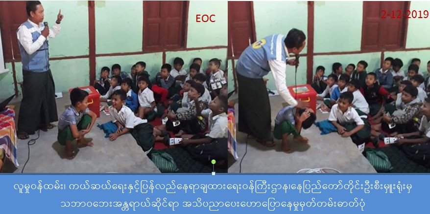 လူမှုဝန်ထမ်း၊ ကယ်ဆယ်ရေးနှင့်ပြန်လည်နေရာချထားရေးဝန်ကြီးဌာန၊ ဘေးအန္တရာယ်ဆိုင်ရာစီမံခန့်ခွဲ မှုဦးစီးဌာန၊ နေပြည်တော်တိုင်းဦးစီးမှူးရုံးမှ တာဝန်ရှိသူများသည် (၂-၁၂-၂၀၁၉) ရက်နေ့၊ (၁၃:ဝ၀) ချိန်မှ (၁၄:၃၀) ချိန်အထိ တပ်ကုန်းမြို့၊ ညောင်လွန့် (အ.ထ.က) စာသင်ကျောင်းတွင်ကျောင်းသား/သူများ သဘာဝဘေးအန္တရာယ်များနှင့် ပက်သက်သော ဆောင်ရန်/ ရှောင်ရန်အချက်များအား သိရှိလိုက်နာ ဆောင်ရွက်နိုင်ရေးအတွက် သဘာဝဘေးအသိပညာပေးဟောပြောပွဲနှင့် ငလျင်ဘေးဖြစ်ပွားလာပါက ဖြစ်ပွားနေစဉ် မည်ကဲ့သို့ပြုမူနေထိုင်ရမည်ကို ကျောင်းသား/သူ (၄၀၀) ဦးအား အသိပညာပေးဟောပြော ခဲ့ပြီးတက်ရောက်လာသူများအား သဘာဝဘေးအသိပညာပေးလက်ကမ်းစာစောင်များ၊ ဗီနိုင်းပိုစတာ၊ နံရံကပ်ပိုစတာနှင့် မုန့်များဖြန့်ဝေပေးခဲ့ကြောင်းသတင်းရရှိပါသည်။