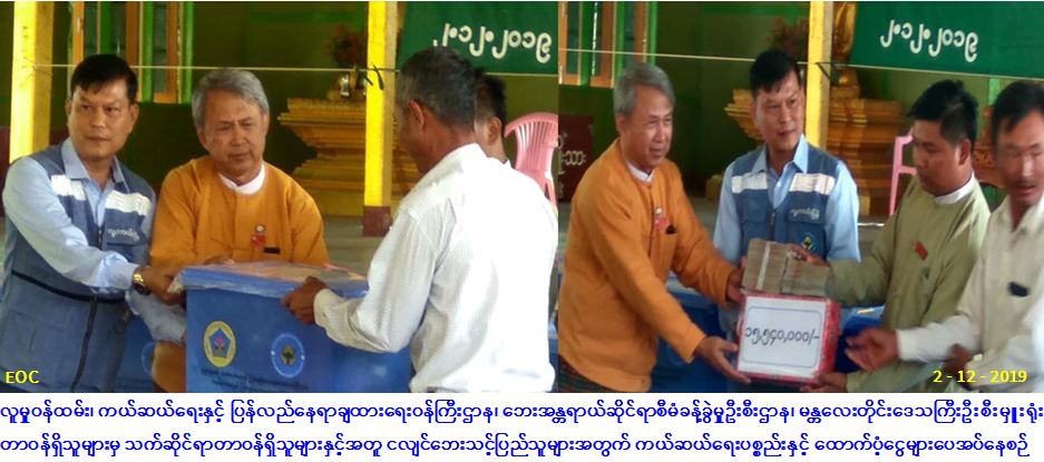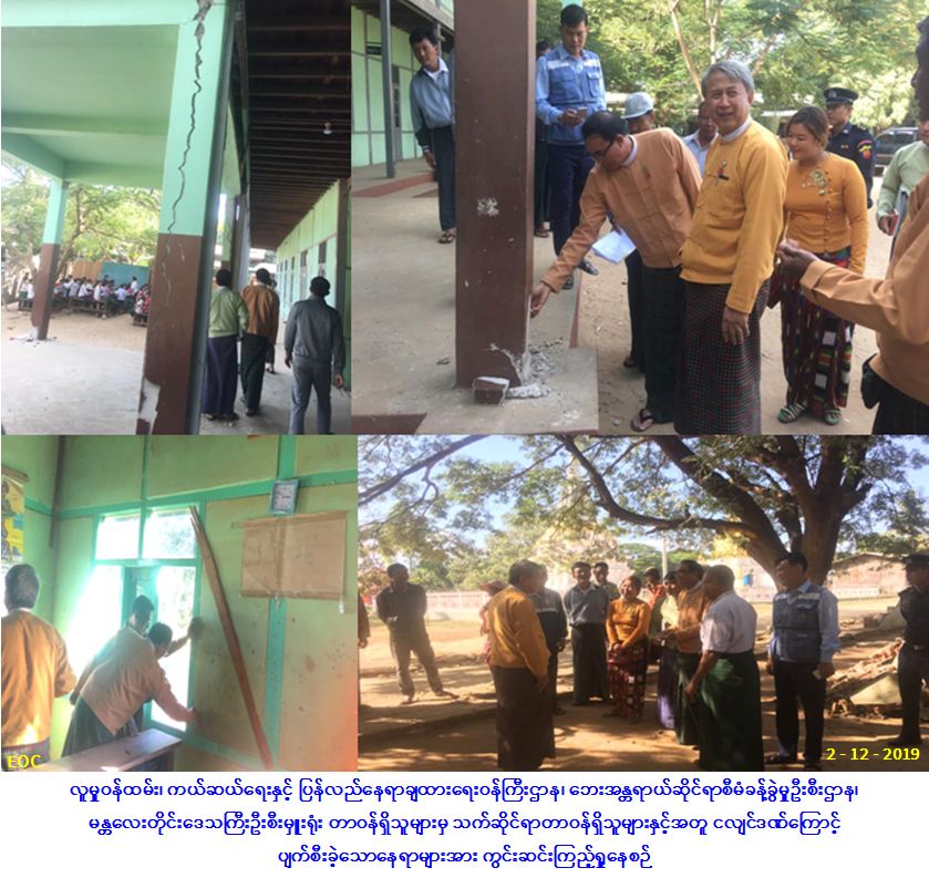 လူမှုဝန်ထမ်း၊ ကယ်ဆယ်ရေးနှင့် ပြန်လည်နေရာချထားရေးဝန်ကြီးဌာန၊ ဘေးအန္တရာယ်ဆိုင်ရာစီမံခန့်ခွဲမှု ဦးစီးဌာန၊ မန္တလေးတိုင်းဒေသကြီးဦးစီးမှူးရုံးမှ တာဝန်ရှိသူများသည် သပိတ်ကျင်းမြို့နယ်တွင်း၌ (၂၈-၁၁-၂၀၁၉) ရက်နေ့တွင် လှုပ်ခတ်ခဲ့သော ငလျင်ကြောင့် ပျက်စီးဆုံးရှုံးခဲ့သော အိမ်ထောင်စု (၁၇၆) စုအတွက် ကယ်ဆယ်ရေး ပစ္စည်း (၁၀) မျိုး (၁၇၆) အိမ်ထောင်စာ၊ အိမ်ခြေ (၁၇၇) အိမ်အတွက် အိမ်ဆောက်ပစ္စည်းဖိုးထောက်ပံ့ငွေ (၁၆,၄၅၀,၀၀၀/-) ကျပ်၊ ဘုန်းတော်ကြီးကျောင်း (၄) ကျောင်းအတွက် ထောက်ပံ့လှူဒါန်းငွေ (၄၀၀,၀၀၀/-) ကျပ်၊ စုစုပေါင်းထောက်ပံ့ငွေ (၁၆,၈၅၀,၀၀၀/-)ကျပ်နှင့် ကယ်ဆယ်ရေးပစ္စည်း (၁၀) မျိုးပါ (၁၇၆) အိမ်ထောင်စုစာ တို့အား မန္တလေးတိုင်းဒေသကြီးအစိုးရဖွဲ့မှ သယံဇာတနှင့် သဘာဝပတ်ဝန်းကျင် ထိန်းသိမ်းရေးဝန်ကြီး၊ မန္တတိုင်း ဒေသကြီး၊ ဘေးအန္တရာယ်ဆိုင်ရာစီမံခန့်ခွဲမှုဦးဌာနမှ တိုင်းဦးစီးမှူးနှင့် တာဝန်ရှိသူများ၊ သပိတ်ကျင်းမြို့နယ် အထွေထွေအုပ်ချူပ်ရေးဦးစီးဌာန တာဝန်ရှိသူများမှ (၂-၁၁-၂၀၁၉) ရက်နေ့တွင် ထောက်ပံ့ပေးအပ်ခဲ့ပြီး ငလျင် ဒဏ်ကြောင့် ပျက်စီးခဲ့သောနေရာများအား ကွင်းဆင်းကြည့်ရှုခြင်းများ ဆောင်ရွက်ခဲ့ပါကြောင်း သတင်းရရှိပါ သည်။