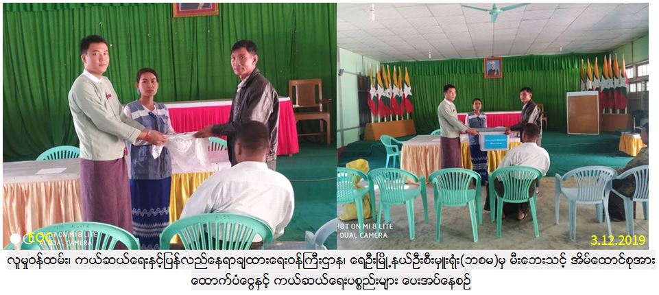 လူမှုဝန်ထမ်း၊ ကယ်ဆယ်ရေးနှင့်ပြန်လည်နေရာချထားရေးဝန်ကြီးဌာန၊ ဘေးအန္တရာယ်ဆိုင်ရာစီမံခန့်ခွဲမှုဦးစီးဌာန၊ ရေဦးမြို့နယ်ဦးစီးမှူးရုံးမှ တာဝန်ရှိသူများသည် ရွှေဘိုခရိုင်၊ တန့်ဆည်မြို့နယ်၊ ခရုတောကျေးရွာ၌ (၁-၁၂-၂၀၁၉) ရက်နေ့တွင် ဖြစ်ပွားခဲ့သော မီးဘေးကြောင့် ဘေးသင့်အိမ်ခြေ (၁) လုံး၊ အိမ်ထောင်စု (၁) စုအတွက် ကယ်ဆယ်ရေးပစ္စည်း (၁၆) မျိုး (၁) အိမ်ထောင်စာ၊ အိမ်ဆောက်ပစ္စည်းဖိုးငွေ (၁၀၀,၀၀ဝိ/-) ကျပ်နှင့် လူဦးရေ (၅) ဦးအတွက် ဆန်ရိက္ခာ ဖိုးငွေ (၁၀,၅၀ဝိ/-) ကျပ်တို့အား (၃-၁၂-၂၀၁၉) ရက်နေ့တွင် တန့်ဆည်မြို့နယ်သို့ သွားရောက်ထောက်ပံ့ပေးအပ်ခဲ့ပါကြောင်း သတင်းရရှိပါသည်။
