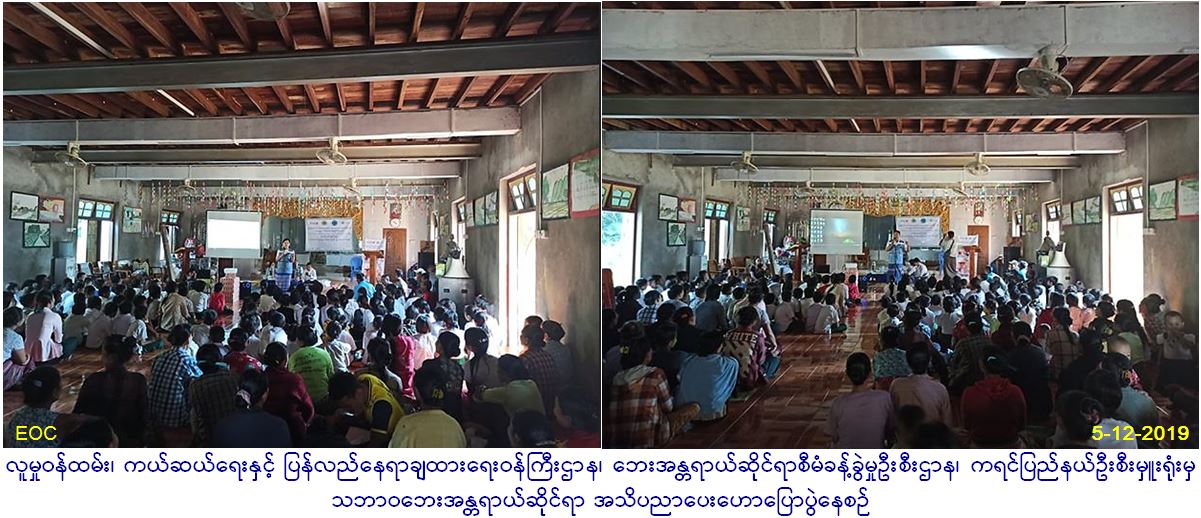 လူမှုဝန်ထမ်း၊ ကယ်ဆယ်ရေးနှင့် ပြန်လည်နေရာချထားရေးဝန်ကြီးဌာန၊ ဘေးအန္တရာယ်ဆိုင်ရာစီမံခန့်ခွဲမှုဦးစီးဌာန၊ ကရင် ပြည်နယ်ဦးစီးမှူးရုံးမှတာဝန်ရှိသူများသည် (၅-၁၂-၂၀၁၉) ရက်နေ့တွင် ဘားအံမြို့နယ်၊ အ.မ.က (မရင်းကုန်း) ကျောင်း၌ ကျောင်းသား/သူနှင့် ကျောင်းသားမိဘ(၂၅၀)ဦးတို့အား ငလျင်ဘေး၊ မိုးကြိုးဘေး၊ မုန်တိုင်းဘေး၊ ရေဘေးနှင့်ပတ်သက်၍ ဆောင်ရန်/ရှောင်ရန်အချက်များအား အသိပညာပေးဆွေးနွေးဟောပြောခဲ့ပြီး လက်ကမ်းစာစောင်များ ဖြန့်ဝေပေးခဲ့ပါကြောင်း သတင်းရရှိပါသည်။