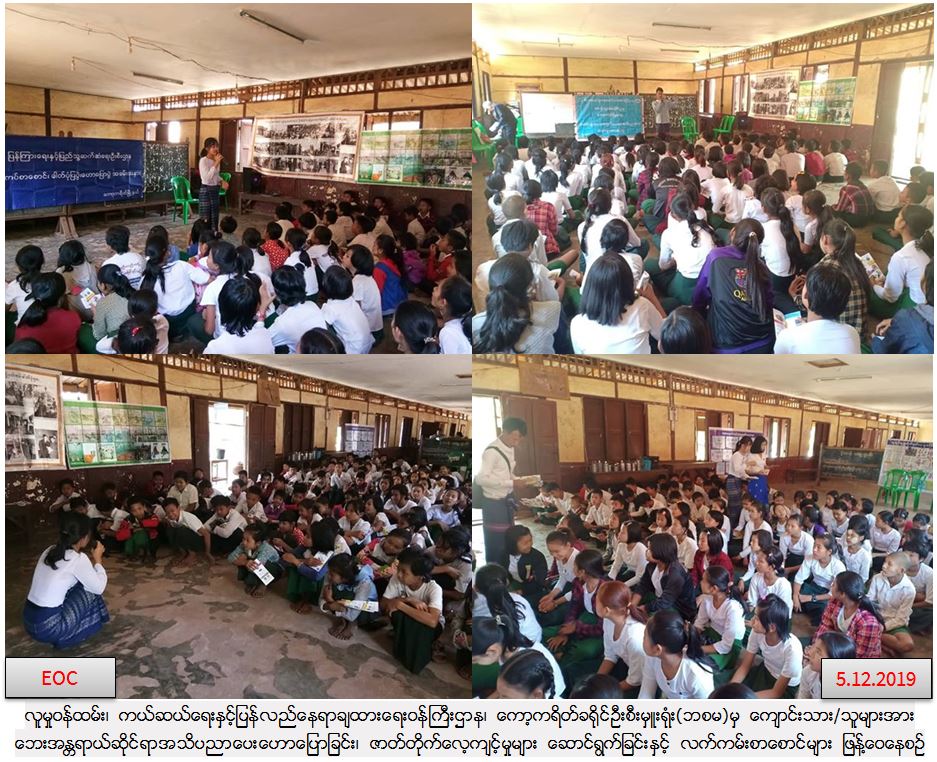 လူမှုဝန်ထမ်း၊ ကယ်ဆယ်ရေးနှင့်ပြန်လည်နေရာချထားရေးဝန်ကြီးဌာန၊ ဘေးအန္တရယ်ဆိုင်ရာစီမံခန့်ခွဲမှုဦးစီးဌာန၊ ကော့ကရိတ်ခရိုင်ဦးစီးမှူးရုံးမှ တာဝန်ရှိသူများသည် (5.12.2019)ရက်နေ့ (13:30)နာရီမှ (15:10)နာရီထိ ကော့ကရိတ်မြို့နယ်၊ လှိုင်ဝရွာရှိ အခြေခံပညာအလယ်တန်းကျောင်း၌ ဆရာ/ဆရာမ၊ ကျောင်းသား/သူ စုစုပေါင်း(170)ဦးတို့ အား ဦးစီးဌာနနှင့်ပတ်သက်သောလုပ်ငန်းတာဝန်များ၊ ထောက်ပံ့နှုန်းထားများ၊ သဘာဝဘေးများဖြစ်ပွားလာပါက ကြိုတင်ပြင်ဆင်နိုင်ရန်အတွက် ဆောင်ရန်/ရှောင်ရန်များ၊ မိုးကြိုးဘေးဖြစ်ပွားပါက မည်ကဲ့သို့ပြုမူနေထိုင်ရမည်ကို လိုက်ပါဆောင်ရွက်စေခြင်းများအား အသိပညာပေးဟောပြောခဲ့ပြီး လက်ကမ်းစာစောင်များကိုလည်းဖြန့်ဝေပေးခဲ့ပါကြောင်း သတင်းရရှိပါသည်။