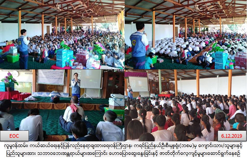 လူမှုဝန်ထမ်း၊ ကယ်ဆယ်ရေးနှင့် ပြန်လည်နေရာချထားရေးဝန်ကြီးဌာန၊ ဘေးအန္တရာယ်ဆိုင်ရာစီမံခန့်ခွဲမှုဦးစီးဌာန၊ ကရင်ပြည်နယ်ဦးစီးမှူးရုံးမှ တာဝန်ရှိသူများသည် (၆-၁၂-၂၀၁၉) ရက်နေ့တွင် ဘားအံမြို့နယ်၊ ကော့ရင်းအထက်ကျေးရွာ၌ အ.လ.က (ကော့ရင်း)အထက် ကျောင်းသူ/သားများနှင့် ကျေးရွာသူ/သား(၄၅၀)တို့အား ငလျင်ဘေး၊ မိုးကြိုးဘေး၊ မုန်တိုင်းဘေး၊ ရေဘေးနှင့်ပတ်သက်၍ ဆောင်ရန်/ရှောင်ရန်အချက်များအား အသိပညာပေးဆွေးနွေးဟောပြောခဲ့ပြီး လက်ကမ်းစာစောင်များ ဖြန့်ဝေပေးခဲ့ကြောင်း သတင်းရရှိပါသည်။