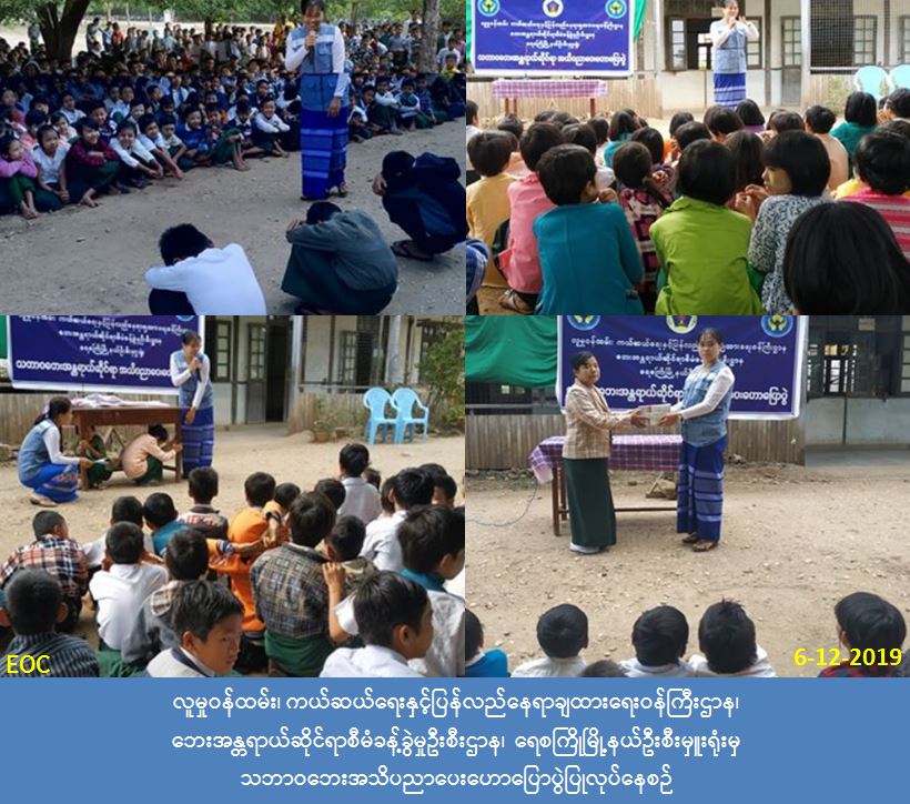 လူမှုဝန်ထမ်း၊ ကယ်ဆယ်ရေးနှင့်ပြန်လည်နေရာချထားရေးဝန်ကြီးဌာန၊ ဘေးအန္တရာယ်ဆိုင် ရာစီမံခန့်ခွဲမှုဦးစီးဌာန၊ ရေစကြိုမြို့နယ်ဦးစီးမှူးရုံးမှ တာဝန်ရှိသူများသည်(၆-၁၂-၂၀၁၉) ရက်နေ့၊ နံနက် (၉:၀၀) နာရီအချိန်မှ (၁၀:၃၀) နာရီအချိန်အထိ ရေစကြိုမြို့နယ်၊ ဖူလုံကျေးရွာ၊ (အ.ထ.က) ကျောင်း၌ ဆရာ/ဆရာမနှင့် ကျောင်းသား/ကျောင်းသူ (၁၀၈၀) ဦး တို့အား ငလျင်ဘေး၊ မိုးကြိုးဘေး၊ မုန်တိုင်းဘေး၊ ရေဘေးနှင့်ပတ်သက်၍ ဆောင်ရန်/ ရှောင်ရန်အချက်များအား အသိပညာပေးဆွေးနွေး ဟောပြောခဲ့ပြီး တက်ရောက်လာသူများ ကို လက်ကမ်းစာစောင်များဝေငှခဲ့ကြောင်းသတင်းရရှိပါသည်။