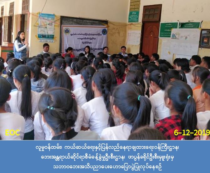 လူမှုဝန်ထမ်း၊ ကယ်ဆယ်ရေးနှင့် ပြန်လည်နေရာချထားရေးဝန်ကြီးဌာန၊ ဘေးအန္တရာယ် ဆိုင်ရာစီမံခန့်ခွဲမှုဦးစီးဌာန၊ ဖာပွန်ခရိုင်ဦးစီးမှူးရုံးမှ တာဝန်ရှိသူများသည် (၆-၁၂-၂၀၁၉) ရက်နေ့တွင်ဖာပွန်မြို့နယ်၊ အ.လ.က(၄)ဖာပွန်ကျောင်း ၌ ကျောင်းသား/သူ (၂၅၀)ဦးတို့ကို မီးဘေး၊ ရေဘေး၊ မုန်တိုင်းဘေး၊ မြေပြိုဘေးနှင့်ပတ်သက်၍ ဆောင်ရန်/ရှောင်ရန်အချက် များအား အသိပညာပေး ဆွေးနွေးဟောပြောခဲ့ပြီး တက်ရောက်လာသူများကို အသိပညာပေး နံရံကပ်ပိုစတာများနှင့် လက်ကမ်းစာစောင်များ ဖြန့်ဝေပေးခဲ့ပါကြောင်း သတင်းရရှိပါသည်။