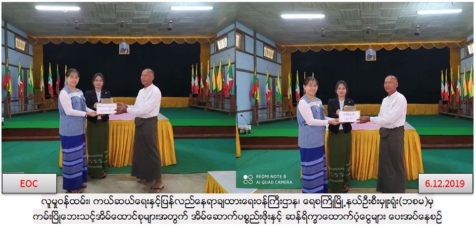 အိမ်ထောင်စု (၄) စုမှ လူဦးရေ (၁၄) ဦးတို့အတွက် အိမ်ဆောက်ပစ္စည်းဖိုးထောက်ပံ့ငွေ (၄၀၀၀၀ဝိ/-) ကျပ်နှင့် ဆန်ရိက္ခာဖိုးထောက်ပံ့ငွေ (၂၉၄၀ဝိ/-) ကျပ် စုစုပေါင်း ကျပ် ( ၄၂၉၄၀ဝိ/-)တို့အား (၆-၁၂-၂၀၁၉)ရက်နေ့တွင် ရေစကြို မြို့နယ်အထွေထွေအုပ်ချုပ်းရေးဌာနအစည်းအဝေးခန်းမ၌