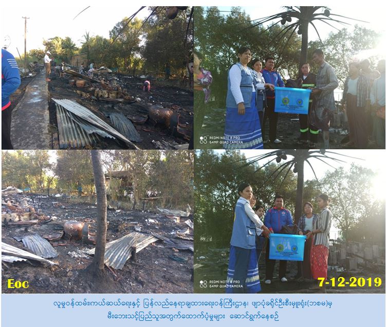 လူမှုဝန်ထမ်း၊ ကယ်ဆယ်ရေးနှင့် ပြန်လည်နေရာချထားရေးဝန်ကြီးဌာန၊ ဘေးအန္တရာယ် ဆိုင်ရာ စီမံခန့်ခွဲမှုဉီးစီးဌာန၊ ဖျာပုံခရိုင်ဦးစီးမှူးရုံးမှ တာဝန်ရှိသူများသည် (၇-၁၂-၂၀၁၉) ရက်နေ့ နံနက် (၀၄:၀၀) နာရီတွင် ကနိကျေးရွာအုပ်စု၊ ကနိချောင်းဝကျေးရွာ၌ မီးဘေးဖြစ်ပွားခဲ့ခြင်းအတွက် မီးဘေးသင့်အိမ်ခြေ (၇) လုံး၊ အိမ်ထောင်စု (၉ ) စု မှ လူဦးရေ (၄၄) ဦး အတွက် လတ်တလော သက်သာစေပေးအပ်ခဲ့ရာ ဖျာပုံခရိုင်မီးသတ်ဦးစီးမှူး၊ ဖျာပုံမြို့နယ် အုပ်ချုပ်ရေးမှူးတို့နှင့် အတူ ပေးအပ်ခဲ့ပြီး ဘေးသင့်ပြည်သူများအား အားပေးစကားများပြောကြားခဲ့ပါသည်။ မီးဘေးသင့် ပြည်သူများအား အိမ်ဆောက်ပစ္စည်းဖိုးထောက်ပံ့ငွေများ၊ ဆန်ရိက္ခာ ဖိုးထောက်ပံ့ငွေများ ဆက်လက်ထောက်ပံ့ပေးရန် စီစဉ်ဆောင်ရွက်လျက်ရှိကြောင်း သတင်းရရှိပါသည်။