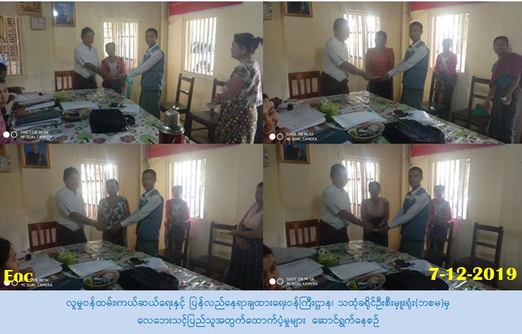 လူမှုဝန်ထမ်း၊ ကယ်ဆယ်ရေးနှင့် ပြန်လည်နေရာချထားရေးဝန်ကြီးဌာန၊ ဘေးအန္တရာယ်ဆိုင်ရာ စီမံခန့်ခွဲမှုဉီးစီးဌာန၊ သထုံခရိုင်ဦးစီးမှူးရုံးမှ တာဝန်ရှိသူများသည် (၆-၁၂-၂၀၁၉) ရက်နေ့၊ (၀၇:၀၀) နာရီခန့်တွင် မွန်ပြည်နယ်၊ ပေါင်မြို့နယ်၊ ပန်းကုန်းကျေးရွာ၌ လေပြင်း တိုက်ခတ်မှု ကြောင့် အမိုးလန်ပျက်စီးခဲ့သည့် လူနေအိမ် (၅) လုံးအတွက် အိမ်ဆောက် ပစ္စည်းဖိုး ထောက်ပံ့ငွေ (၂၂၂,၀၀၀/-) ကျပ်၊ လူဦးရေ (၃၀) ဦးအတွက် (၇) ရက်စာ ဆန်ဖိုးထောက်ပံ့ငွေ (၆၃,၀၀၀/-) ကျပ်၊ စုစုပေါင်းငွေ (၂၈၅,၀၀၀/-) ကျပ်အား (၆-၁၂-၂၀၁၉) ရက်နေ့တွင် ထောက်ပံ့ ပေးခဲ့ပါကြောင်း သတင်းရရှိပါသည်။