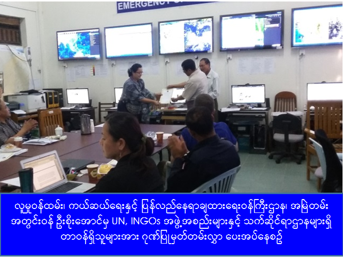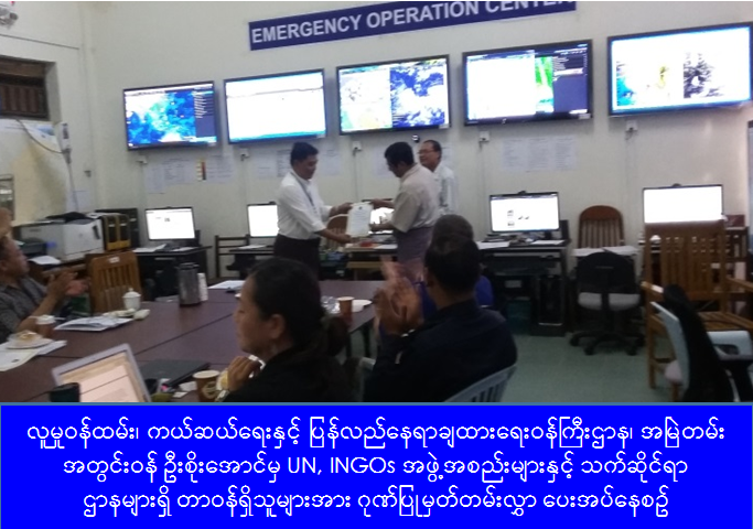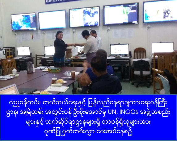 မုန်တိုင်း ရွန်နူ (ROANU) ကျရောက်နေစဉ်အတွင်း ကယ်ဆယ်ရေးနှင့် ပြန်လည်နေရာချထားရေးဦးစီးဌာန၊ EOCနှင့် ပူးပေါင်းဆောင်ရွက်သော UN, INGOs အဖွဲ့အစည်းများနှင့် သက်ဆိုင်ရာဌာနများမှ တာဝန်ရှိသူများအား (၂၂-၅-၂၀၁၆) ရက်နေ့တွင် လူမှုဝန်ထမ်း၊ ကယ်ဆယ်ရေးနှင့် ပြန်လည်နေရာ ချထားရေးဝန်ကြီးဌာန၊ အမြဲတမ်းအတွင်းဝန် ဦးစိုးအောင်မှ ဂုဏ်ပြုမှတ်တမ်းလွှာ ပေးအပ်ခဲ့ပါသည်။