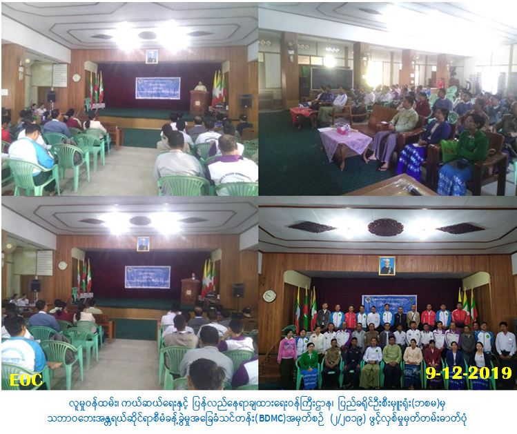 လူမှုဝန်ထမ်း၊ ကယ်ဆယ်ရေးနှင့် ပြန်လည်နေရာချထားရေးဝန်ကြီးဌာန၊ ဘေးအန္တရာယ်ဆိုင်ရာ စီမံခန့်ခွဲမှုဦးစီးဌာန၊ ပြည်ခရိုင်ဦးစီးမှူးရုံးမှတာဝန်ရှိသူများသည် ပြည်ခရိုင်၊ ပန်းတောင်းမြို့နယ်၊ မြို့နယ်ထွေ/အုပ်အစည်းအဝေးခန်းမ၌ (၉-၁၂-၂၁၀၉) ရက်နေ့တွင် သဘာဝဘေးအန္တရယ်ဆိုင်ရာ စီမံခန့်ခွဲမှု အခြေခံသင်တန်း (BDMC) အမှတ်စဉ် (၂/၂၀၁၉) အား ခရိုင်/မြို့နယ်အဆင့်ဌာနဆိုင်ရာ များ၊ အရပ်ဖက်အဖွဲ့အစည်းများ၊ သင်သန်းသူ/သား စုစုပေါင်းအင်းအား (၆၀) ဦး တို့ဖြင့် သင်တန်းဖွင့်လှစ်ခဲ့ပါကြောင်း သတင်းရရှိပါသည်။